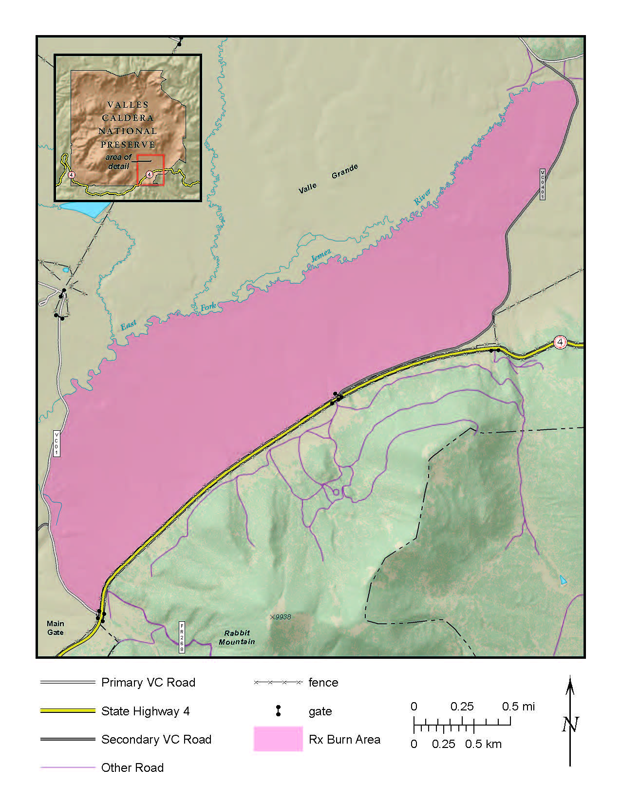The Valles Caldera National Preserve is planning to implement a prescribed burn project on the preserve that will begin as soon as Wednesday, May 11 and be completed within two to three days. The prescribed burn will target up to 1,471 acres of grass in the Valle Grande, adjacent to NM Highway 4 between mile markers 39-42. Traffic delays may occur during the ignition phases of the burn, but we do not anticipate any road closures. If conditions permit, burn operations will occur during mid-day in order minimize impacts to morning and afternoon commuter traffic on NM Hwy. 4.