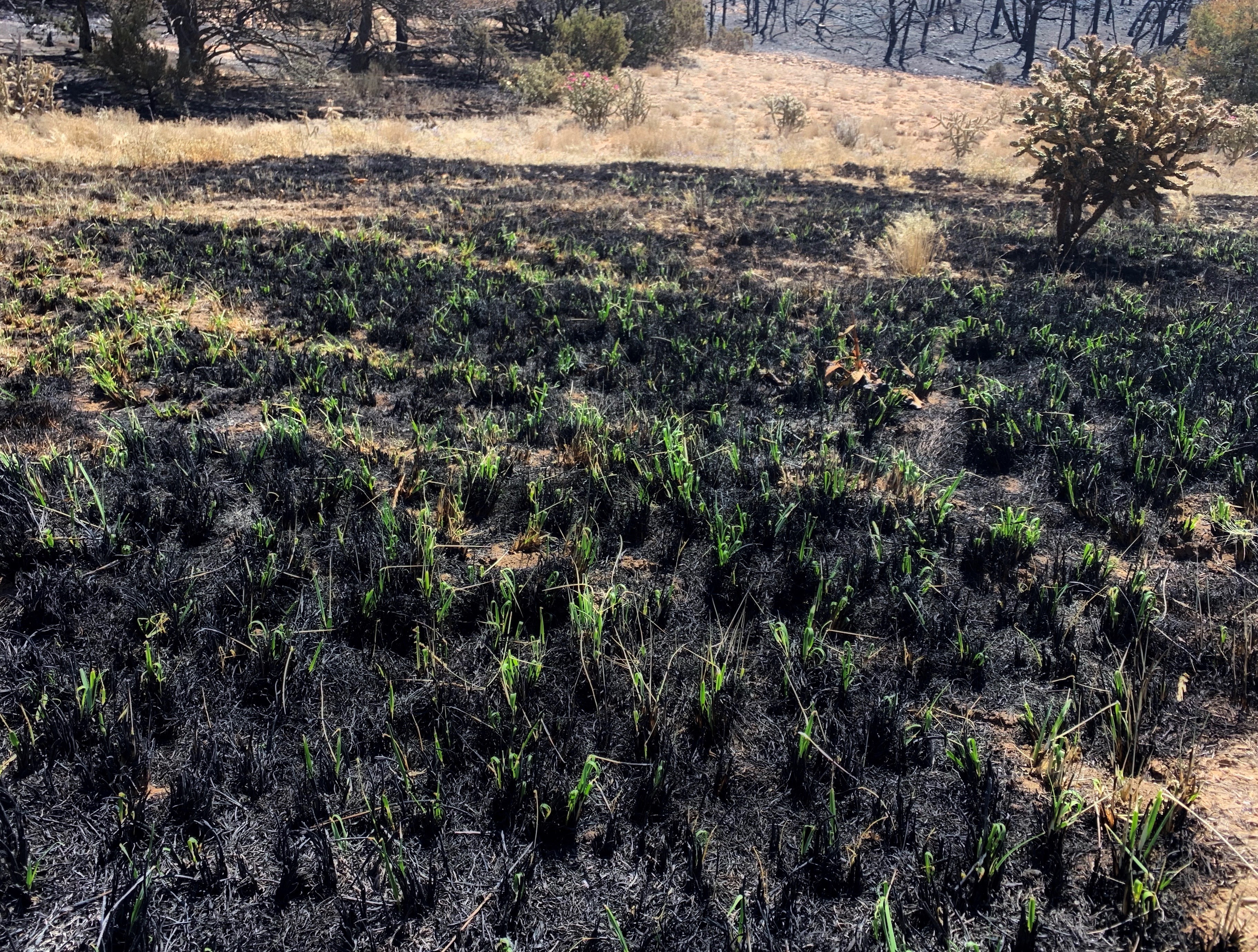 Bright green grasses are already growing in an area that was burned by the Lone Mountain Fire only seven days ago and had yet to see rain. This is because of an increase in soil nutrients produced after low-intensity fires.