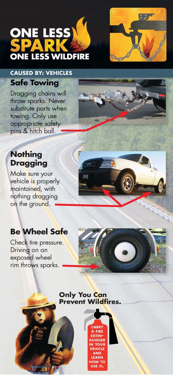 Prevent wildfires with a pre-trip check of your vehicle. Check tire pressure and ensure chains or other items aren’t dragging. Regular maintenance is essential! One Less Spark, One Less Wildfire. Learn more at: https://goo.gl/kCkMQH #PreventWildfires #NMFire #SouthwestWildfireAwarenessWeek