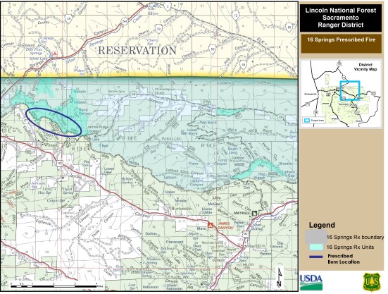 CLOUDCROFT, NM – 7/10/20: The Sacramento Ranger District will conduct a prescribed burn in the 16 Springs area approximately 12 miles northwest of Mayhill, NM beginning Saturday July 11, 2020 and throughout the week as conditions allow.