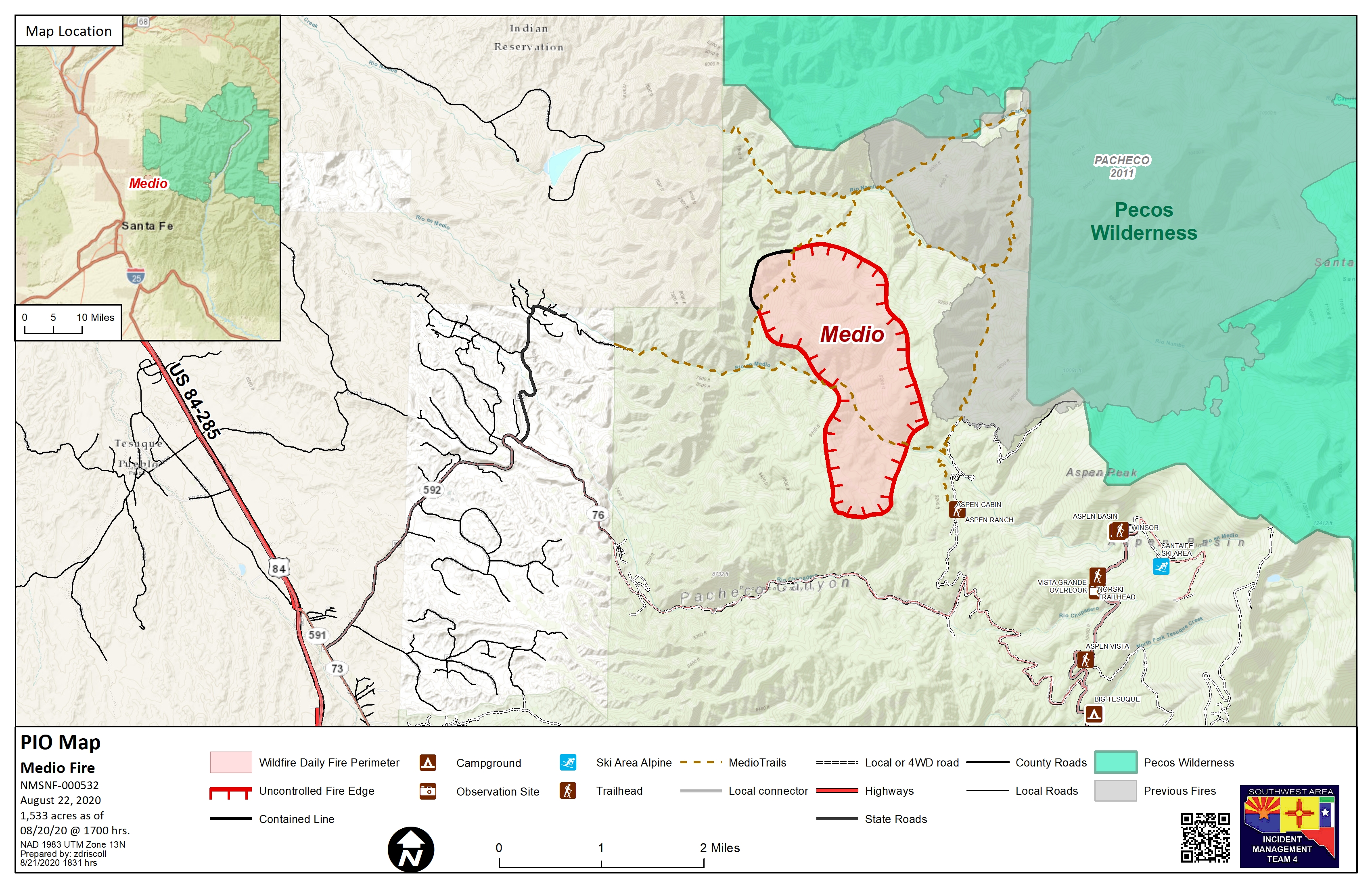 Smoke: Smoke from the Medio Fire is likely to be visible from Santa Fe and surrounding communities as well as along the I-25 and US-285 corridors. Smoke-sensitive individuals and people with respiratory problems or heart disease are encouraged to take precautionary measures. Information on air quality and protecting your health can be found at https://www.env.nm.gov/air-quality/.
