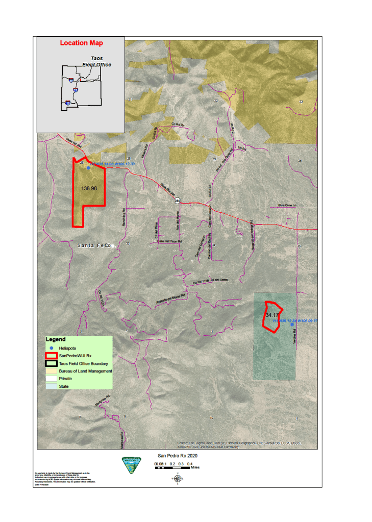 Beginning Nov. 9, the Bureau of Land Management Taos Field Office plans to conduct an up to 200-acre prescribed burn near San Pedro in two units. The first unit is located on BLM-managed lands in Santa Fe County on the south side of NM Highway 344, approximately 1 mile east of the intersection of NM Highway 14 and NM Highway 344. The second unit is on Verbina Road, to the east of the first unit, on State lands.
