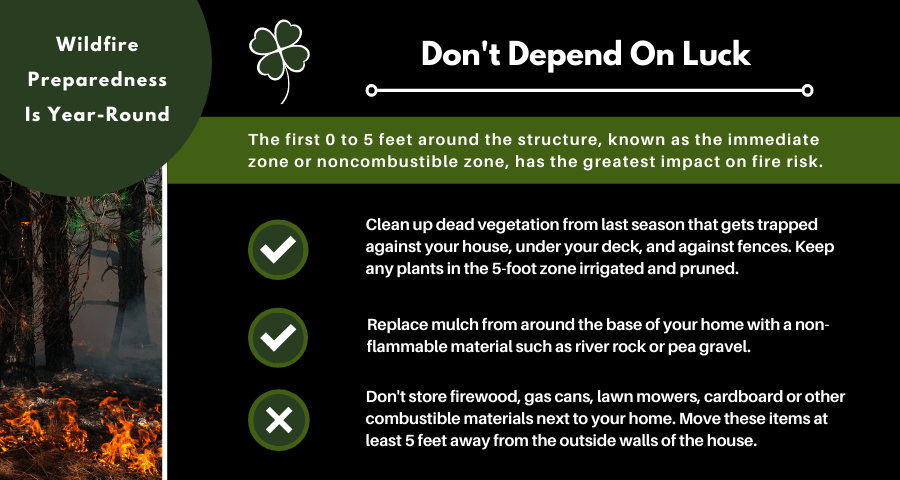 In the last 15 years, wildfire has destroyed 89,210 structures, with 62% of the total structures lost in 2017, 2018, and 2020 combined. As we begin to spend more time outdoors, pay attention to your home and property with wildfire in mind – consider ember and flame contact. While there are no guarantees when it comes to wildfire, don’t depend on luck.