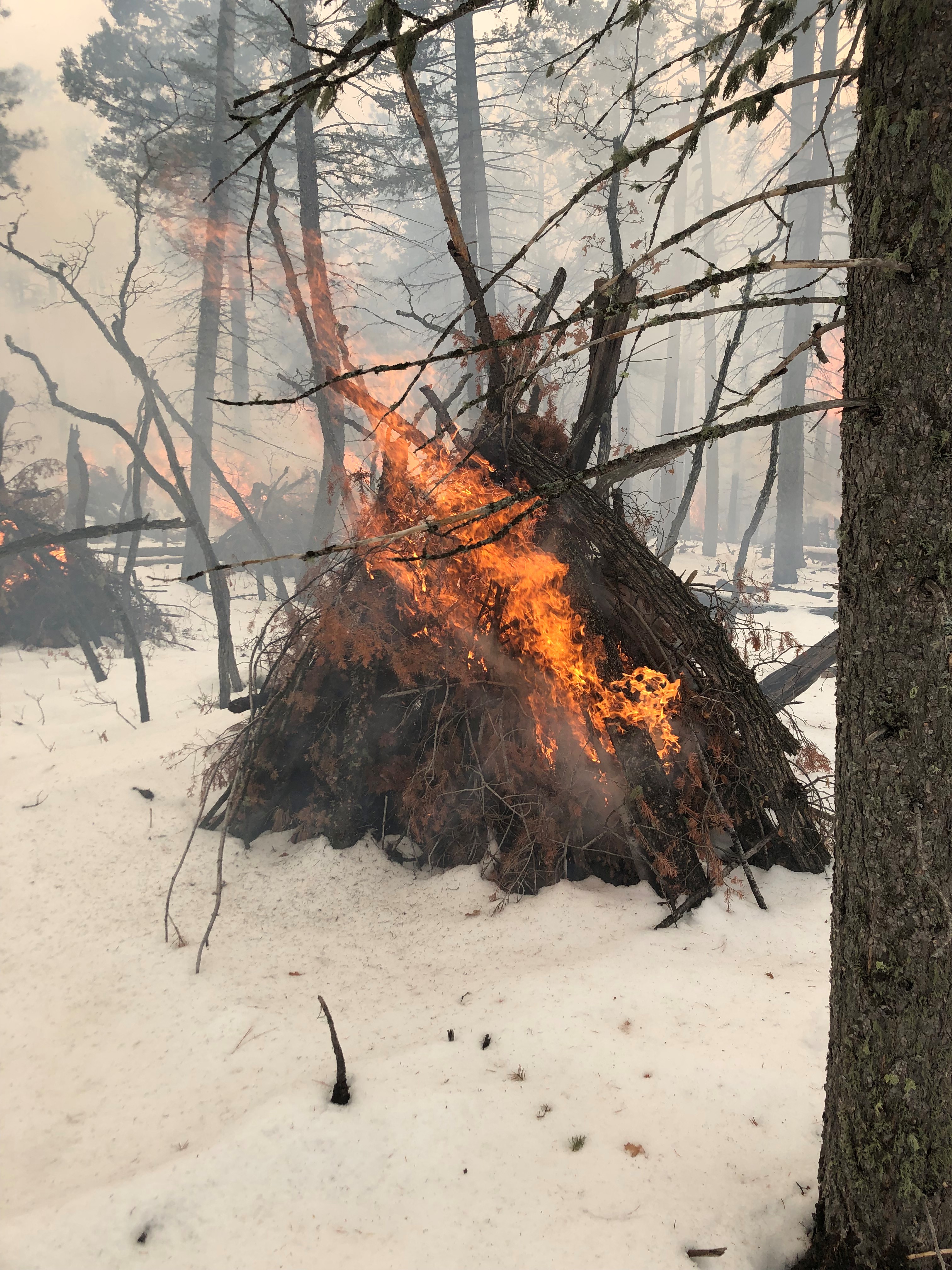 Winter is an optimal time to burn piled slash and woody debris from earlier forest restoration work because snow on the ground keeps the fire from spreading to adjacent vegetation. Generally, pile burns produce less smoke and burn with less intensity than broadcast burns across a larger landscape. In some areas, smoke may settle into lower elevations overnight due to fluctuating atmospheric temperatures that produce nighttime inversions.