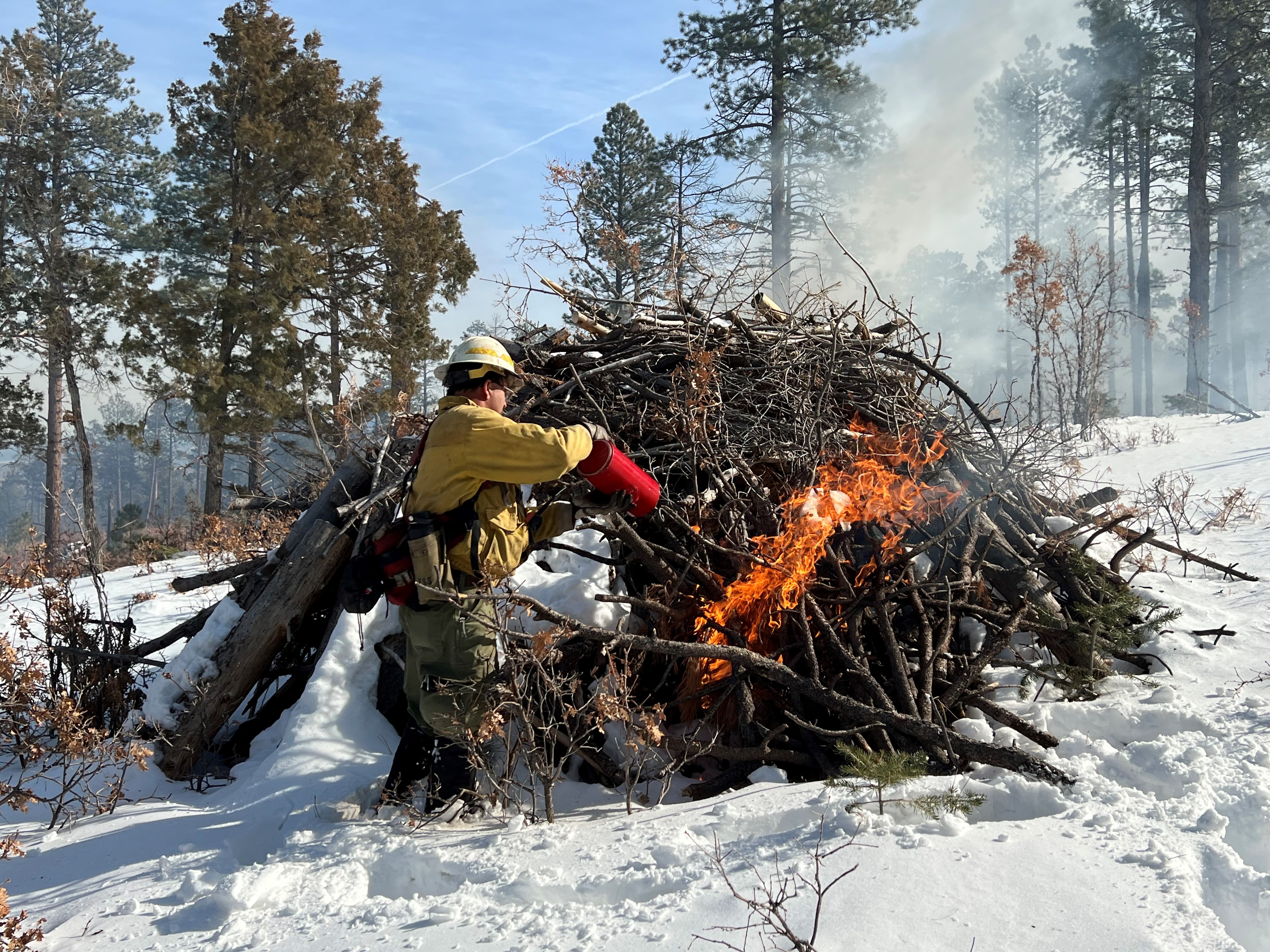 The decision to proceed will depend on multiple factors, including snowpack, fuel moisture levels, air quality, ventilation, forecasted weather and wind, and resource availability. Winter is an optimal time to burn piled slash and woody debris from earlier forest restoration work because snow on the ground keeps the fire from spreading to adjacent vegetation. Generally, pile burns produce less smoke and burn with less intensity than broadcast burns across a larger landscape.