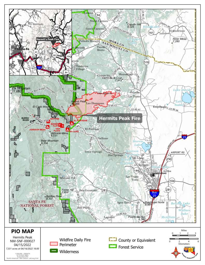 Reflejos: El equipo número 1, tipo 1 de manejo de incidentes del área suroeste asumió el mando del incendio Hermits Peak el viernes 15 de abril de 2022 y continuó los esfuerzos de contención durante la noche, aumentando la contención total al 33%. Aunque las condiciones climáticas y de viento desfavorables en terrenos empinados son un desafío para los bomberos, se está logrando progreso constante con el objetivo final de levantar las ordenes de evacuación. Los ordenes de evacuación permanecen sin cambios. Las actualizaciones de video están disponibles diariamente en la página de Facebook del Bosque Nacional Santa Fe: https://www.facebook.com/santafeNF/.