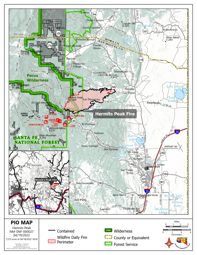 Restrictions: The Santa Fe National Forest has issued a closure order to protect public health and safety during fire operations on the Hermits Peak Fire. The full closure order and map are available at https://www.fs.usda.gov/main/santafe/home. A temporary flight restriction (TFR) is in place over the area, which includes unmanned aircraft, or drones. More information on the dangers drones pose to wildland firefighting aircraft and personnel on the ground can be found at: www.nifc.gov/drones.
