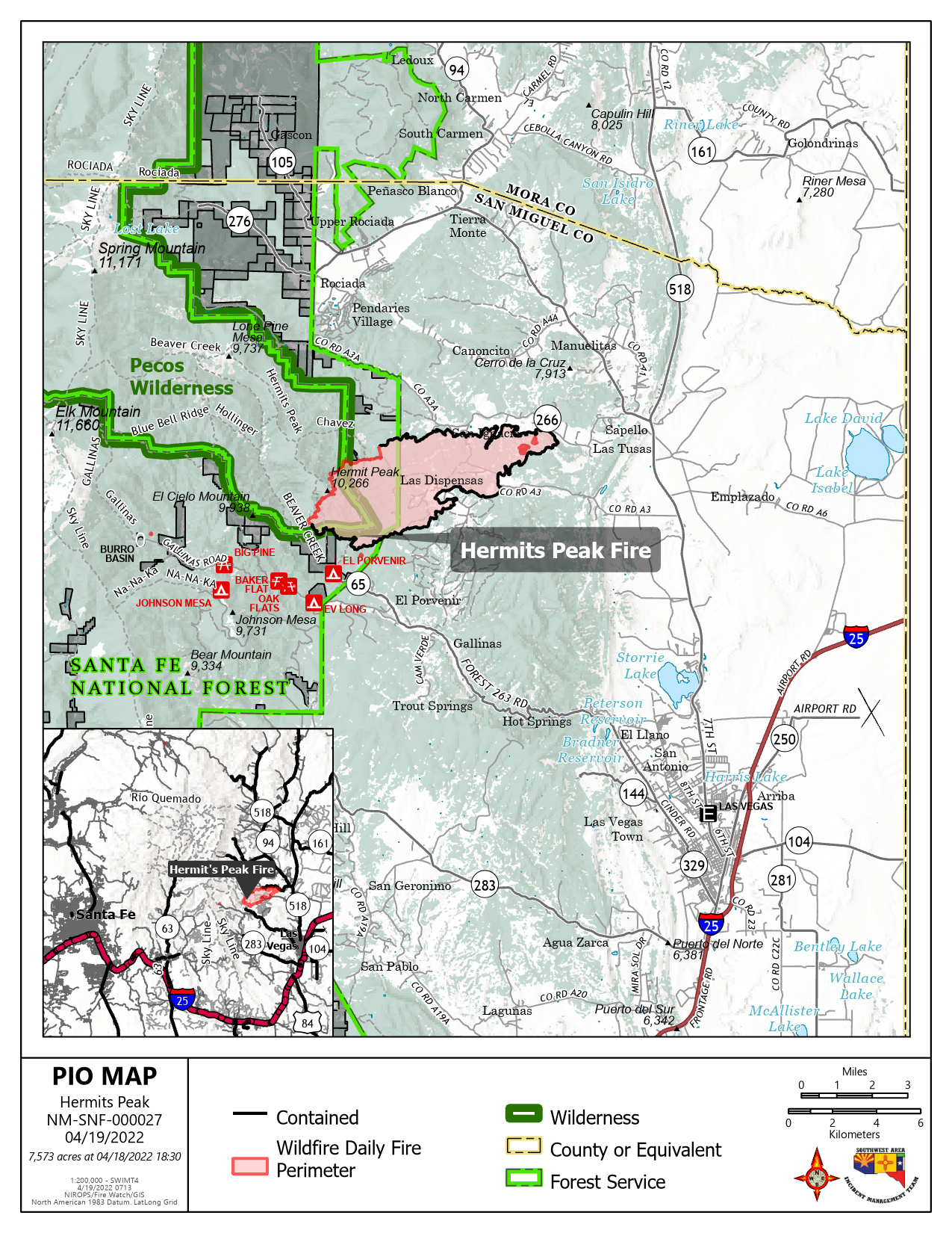 | Causa: Múltiples incendios puntuales se propagaron más allá de los límites del proyecto de incendios prescrito. Contención: 81% Personal total: 567 | Localización: aproximadamente 12 millas al noroeste de Las Vegas, NM, Distrito de guardabosques Pecos/Las Vegas, Hermits Peak/ Zona Silvestre Pecos Combustibles: Conífera mixta |