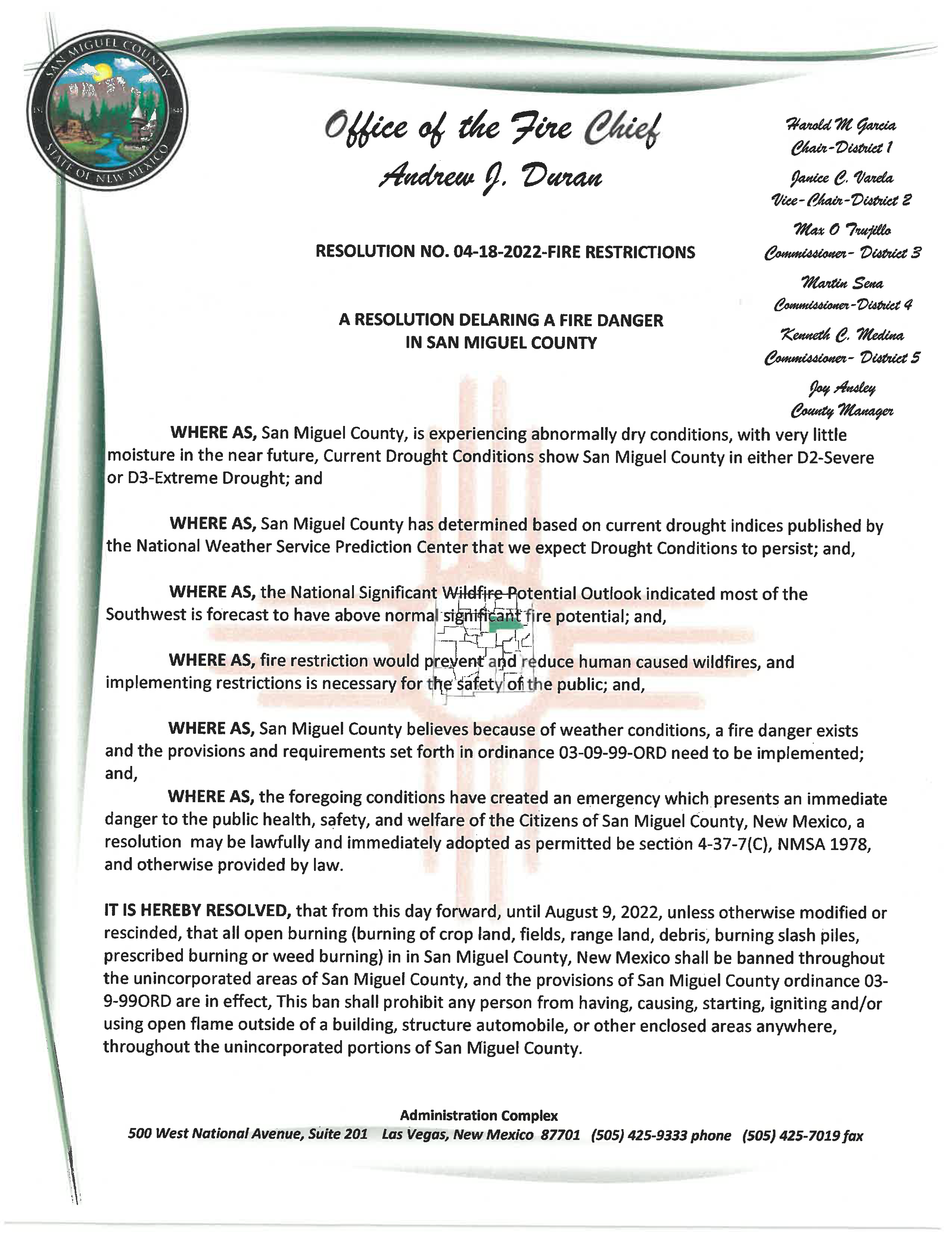 San Miguel County Issues Fire Danger Resolution
