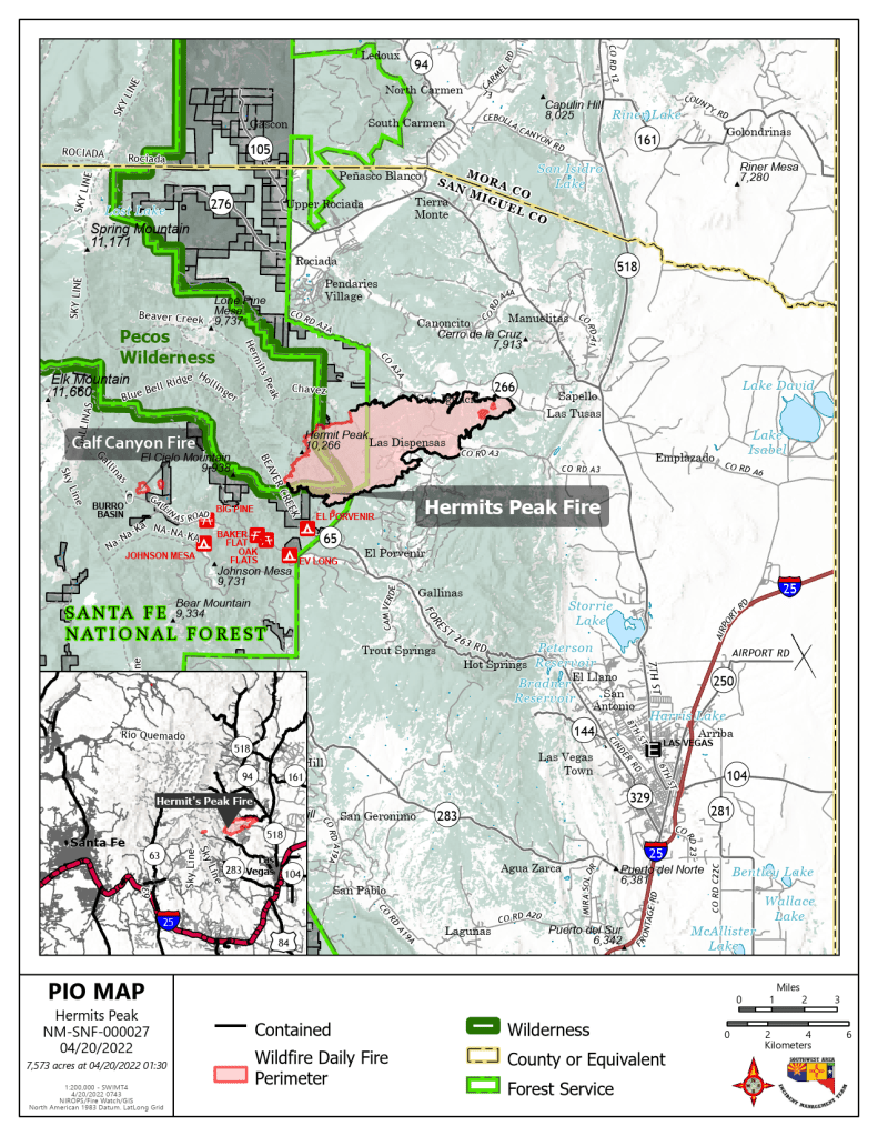 Highlights: With the high winds today, firefighting crews will stay focused on the Hermit’s Peak Fire and holding containment. The Southwest Region is now elevated to a Preparedness Level of 4. Firefighter and public safety remain our number one priority. There was a new fire start on Tuesday in Upper Gallinas, the Calf Canyon Fire. Team 1 supported the fire with two task forces. The phone number for the Hermits Peak Fire has been changed and is also the number to call for information on the Calf Canyon Fire. The new phone number is 505-398-1151.