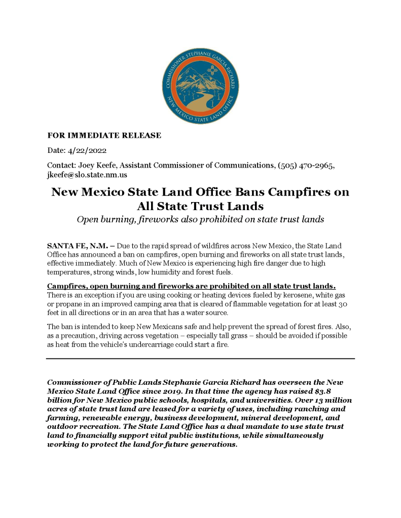 New Mexico State Land Office Bans Campfires, Open Burning, & Fireworks on All State Trust Lands.
