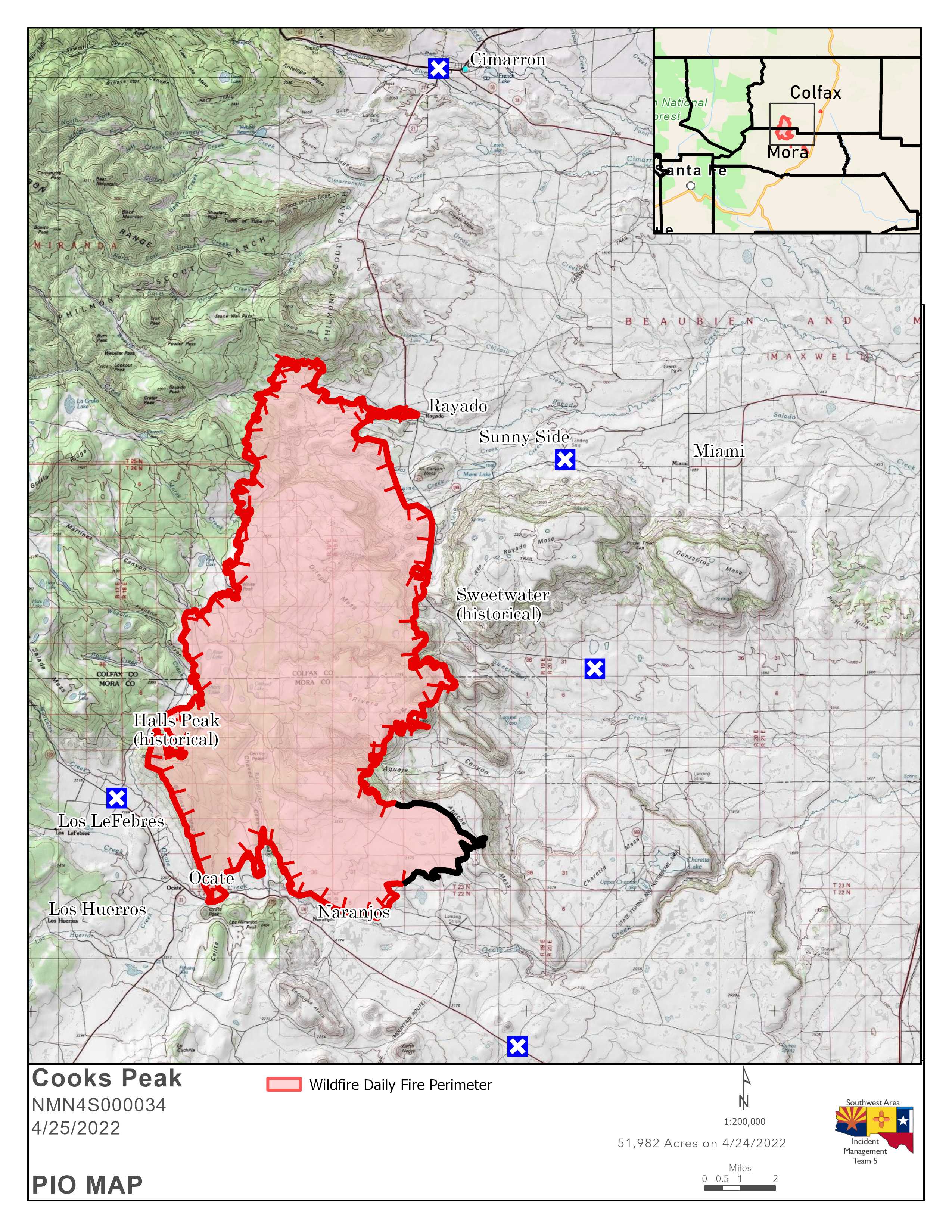 Announcement: The Southwest Area Incident Management Team will host a community meeting on Monday, April 25, 2022, at 7 p.m. to provide updates on the Cooks Peak Fire. The meeting will be held in the Wagon Mound High School Gym at 300 Park Ave., in Wagon Mound. Interested attendees can participate in-person or virtually, via Cooks Peak Fire Facebook Livestream at https://www.facebook.com/CooksPeakFireInfo/.