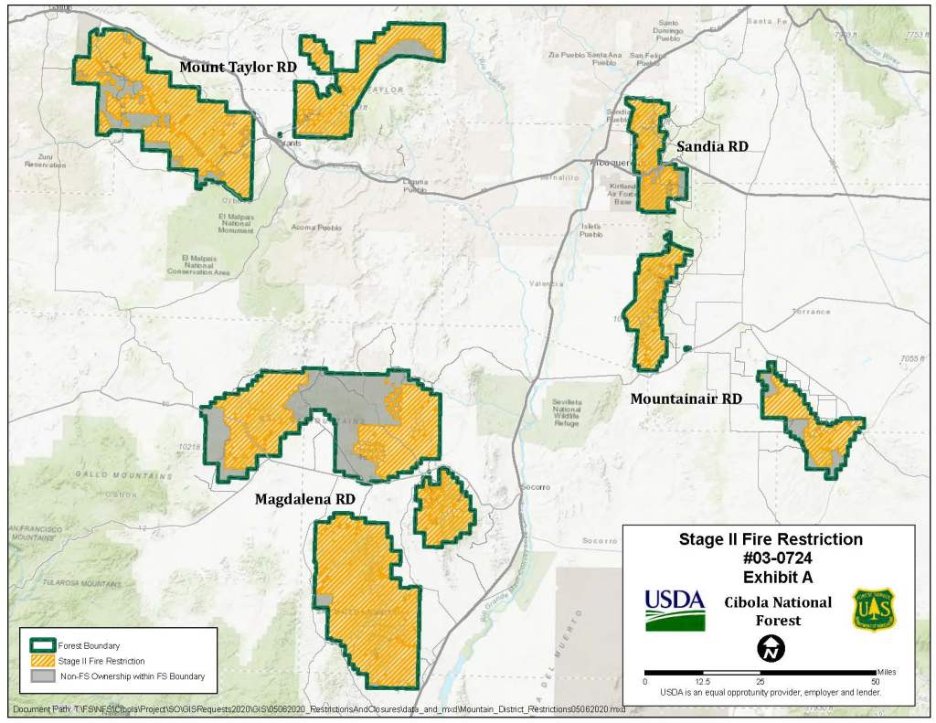 Albuquerque, NM – April 27, 2022 – Based on high fire danger and severe fire weather conditions, the Cibola National Forest and National Grasslands (NF & NGs) will implement Stage 2 Fire Restrictions effective April 29th at 8:00 a.m. per Order 03-0724. This order is for all National Forest System lands, roads and trails within the Cibola NF & NGs in counties of Cibola, McKinley, Socorro, Catron, Sierra, Torrance, Valencia, Bernalillo, Sandoval, and Lincoln within the State of New Mexico as depicted on the attached map at Exhibit A.