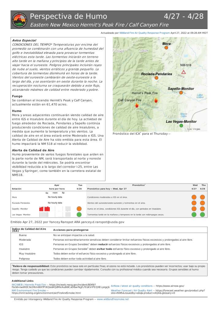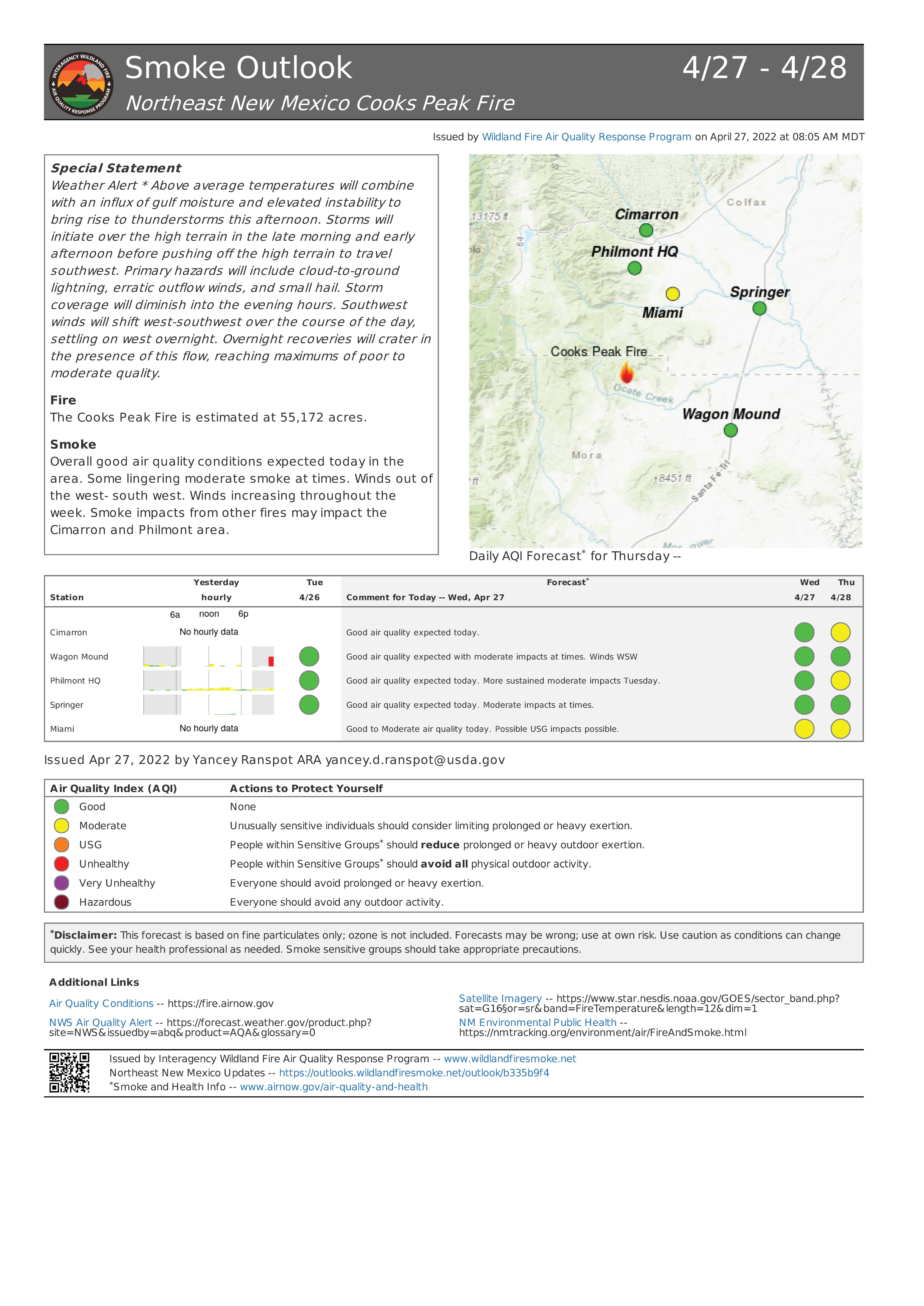 Smoke Outlook – Northeast New Mexico, Cooks Peak Fire (4/27 – 4/28)