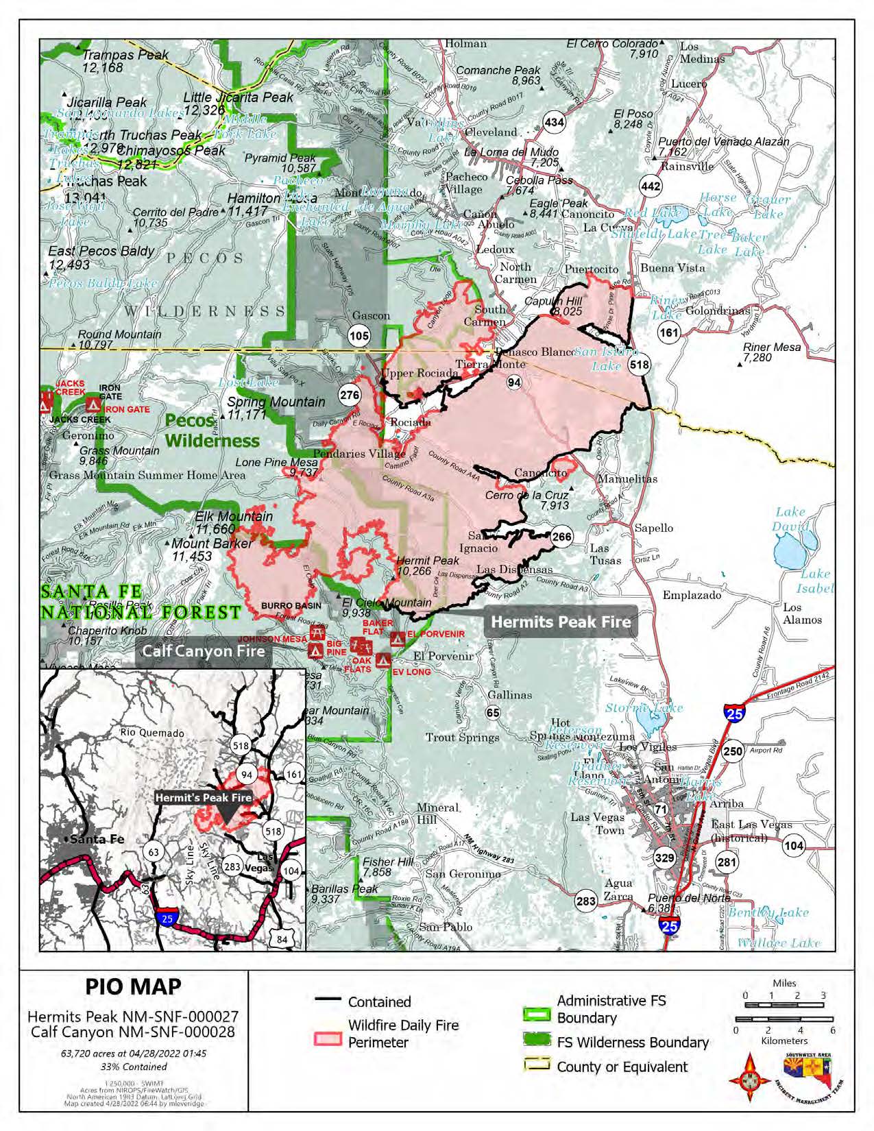 Información sobre incendios futuros: El horario de la oficina de información para los incendios Calf Canyon y Hermits Peak son durante las horas (8:00 AM – 8:00 PM), el número de teléfono (505-356-2636), y la dirección de correo electrónico (2022.calfcanyon@firenet.gov) La información futura sobre incendios seguirá publicados Inciweb, el SFNF Facebook y Twitter, SFNF website, y New Mexico Fire Information website.