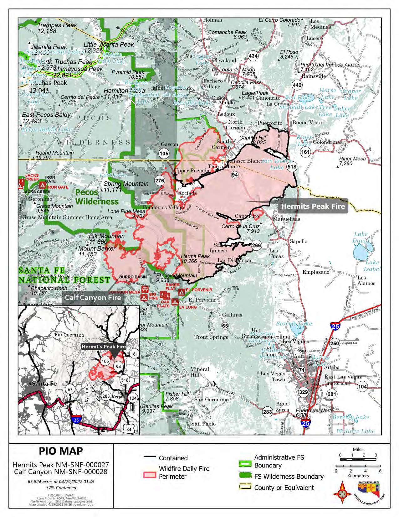 […] on the state’s largest blaze, the The Calf canyon and Hermits peak fire. The fire, which had already consumed more than 63,720 acres on Friday, was 37% contained. A red flag warning remained in effect, with wind gusts of up to 50 mph, poor […]