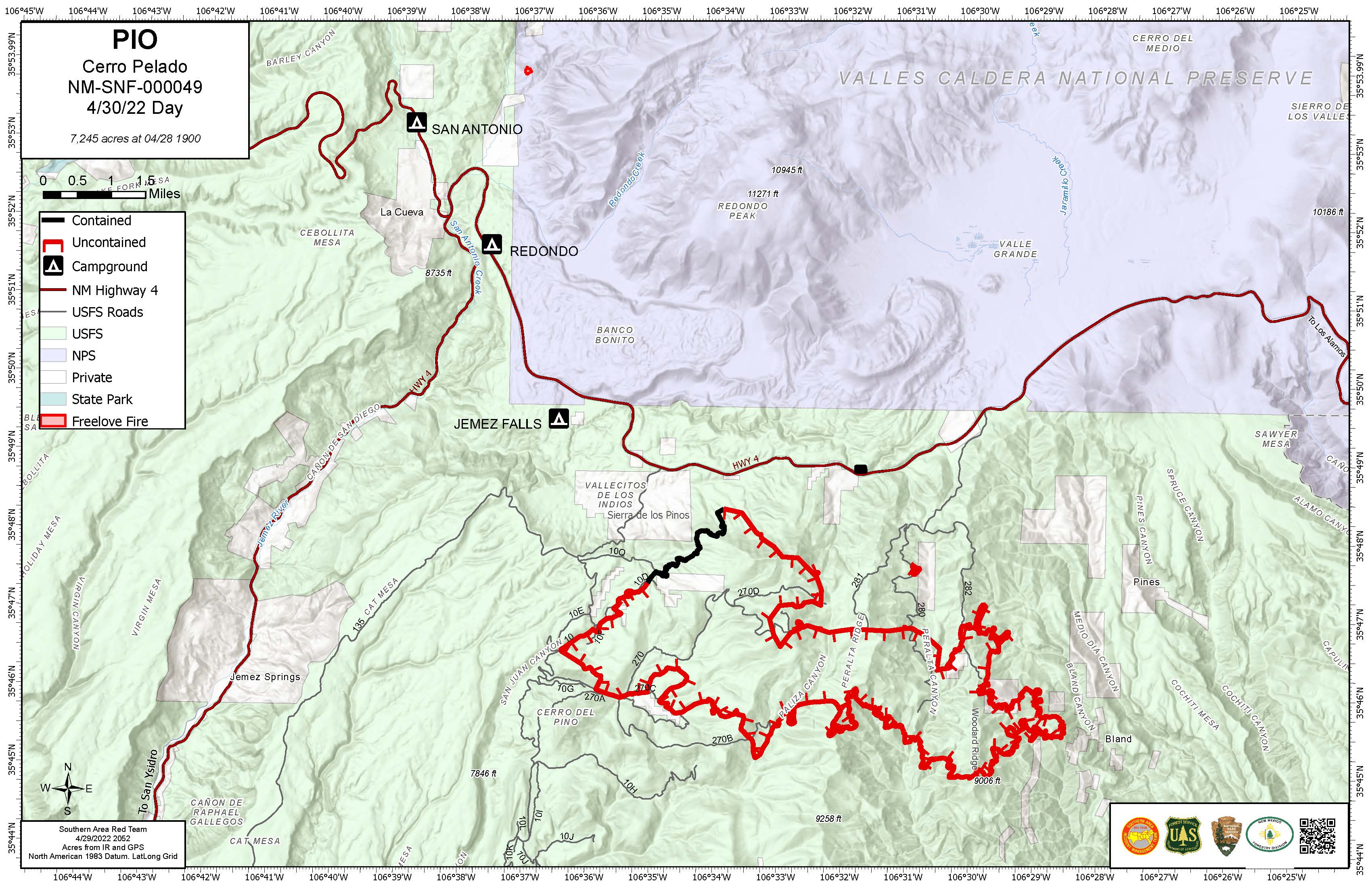 Cerro Pelado Fire: The Cerro Pelado Fire, 7 miles east of Jemez Springs, New Mexico, started on Friday, April 22, during an epic wind event. The cause of the fire is under investigation. It is burning in ponderosa pine and mixed conifer trees and brush. The east part of the fire is burning in the fire footprint from the 2011 Las Conchas Fire. The current fire footprint includes forest units that have previously been treated to reduce fire hazard. Three homes were lost in the fire.