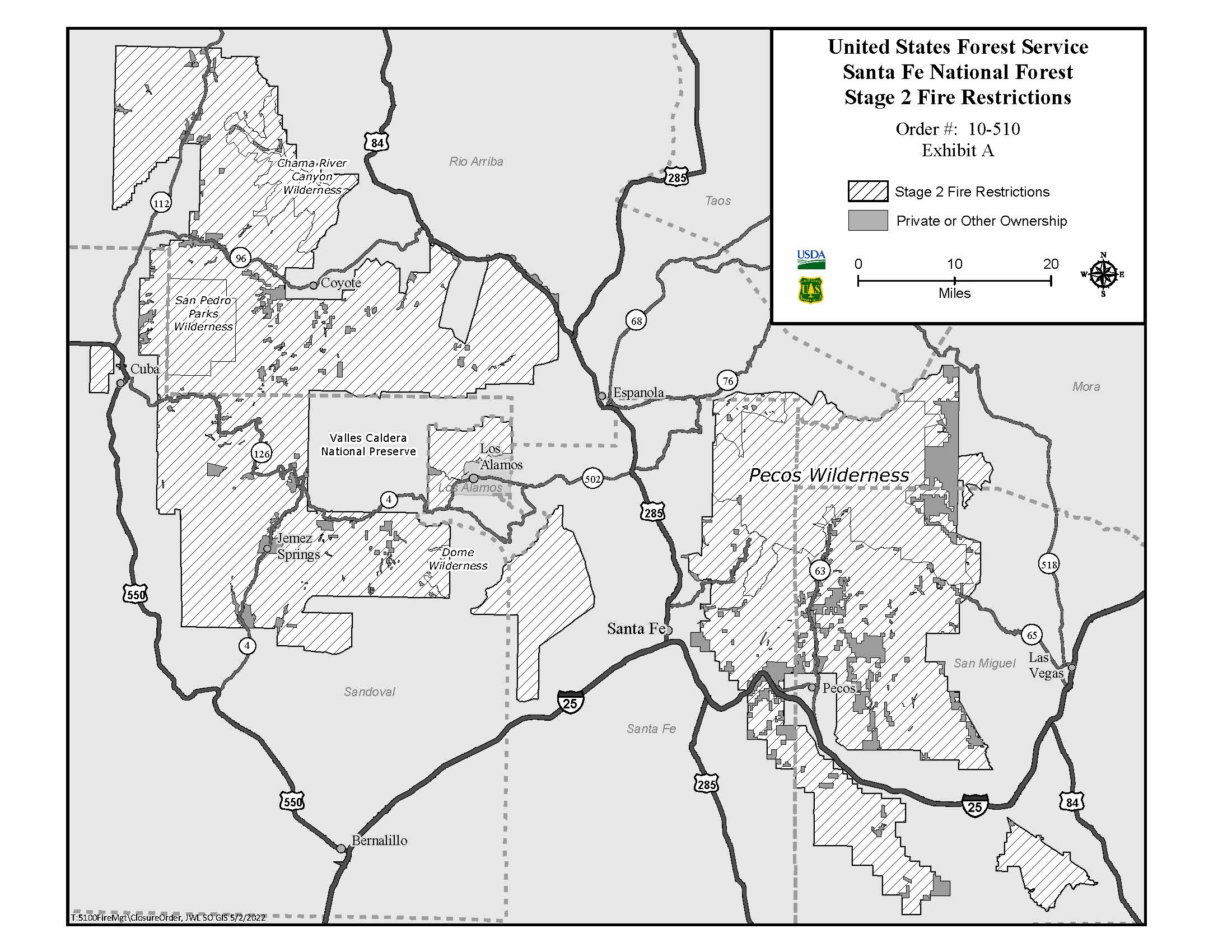 SANTA FE, NM – May 2, 2022 – Based on recent wildfire activity and persistent severe fire weather conditions, the Santa Fe National Forest (SFNF) went into forest-wide Stage 2 fire restrictions on April 22 to reduce the risk of human-caused wildfires. The SFNF amended the fire restriction closure order today to correct a typo in the original order’s wording on equipment powered by an internal combustion engine.