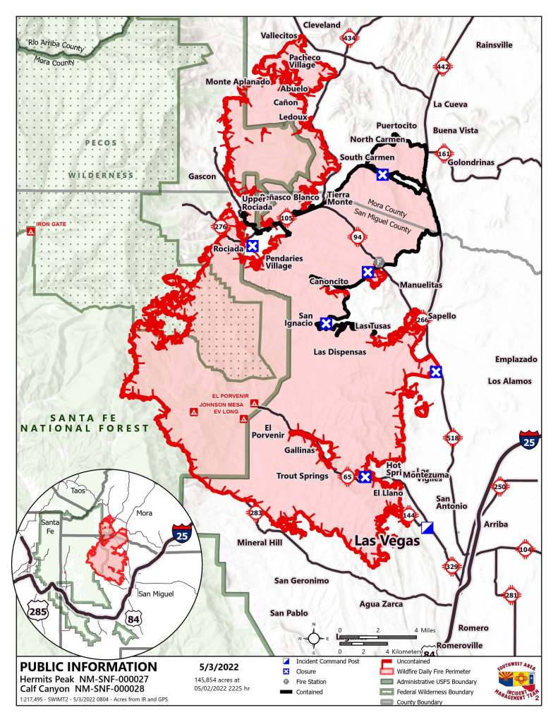 Restricciones: El Santa Fe National Forest ha ampliado la orden de cierre debido al incendio para incluir a todo el Distrito de Guardabosques de Pecos/Las Vegas y ha implementado restricciones de incendios de etapa 2 en todo el bosque. La orden de cierre completa y el mapa están disponibles en www.fs.usda.gov/detail/santafe/alerts-notices/?cid=stelprd3802009. Hay una restricción temporal de vuelo (TFR) sobre la zona. El TFR también cubre los aviones no tripulados, o drones. Si un dron privado se adentra en la zona del incendio, será necesario interrumpir todas las operaciones aéreas e impedir el progreso de la lucha contra el fuego, poniendo a los bomberos en mayor riesgo.
