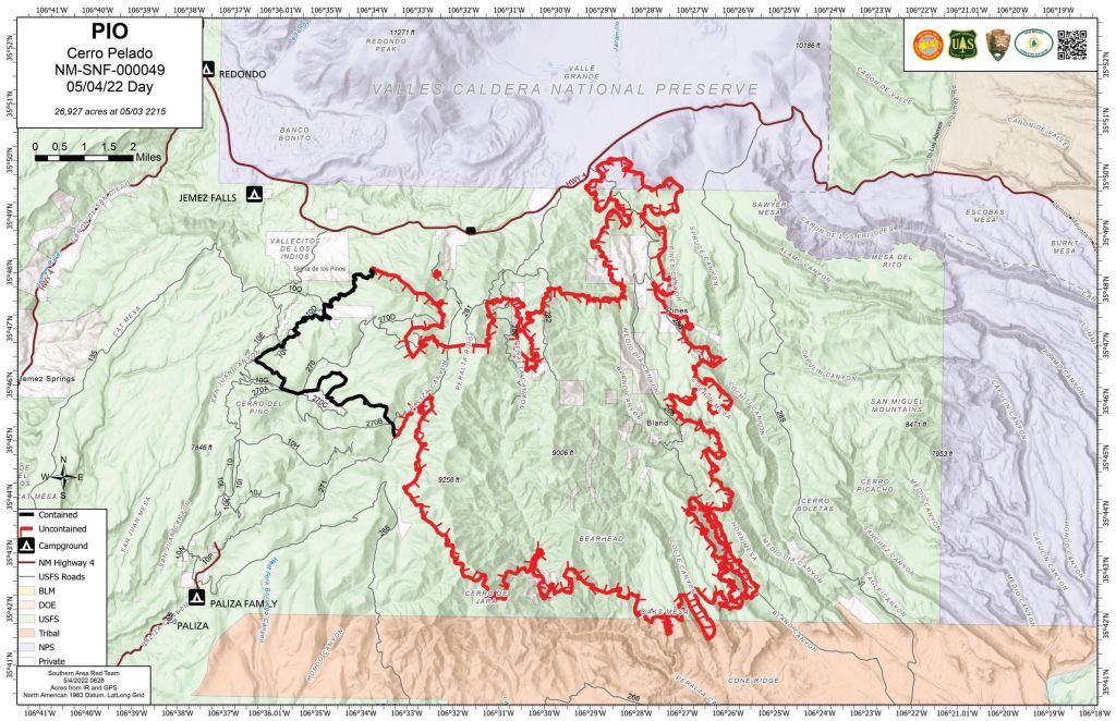 Cerro Pelado Fire: The Cerro Pelado Fire, 7 miles east of Jemez Springs, New Mexico, started on Friday, April 22, during an epic wind event. The cause of the fire is under investigation. It is burning in ponderosa pine and mixed conifer trees and brush. The east part of the fire is burning in the fire footprint from the 2011 Las Conchas Fire. The current fire footprint includes forest units that have previously been treated to reduce fire hazard. Three homes were lost in the fire.
