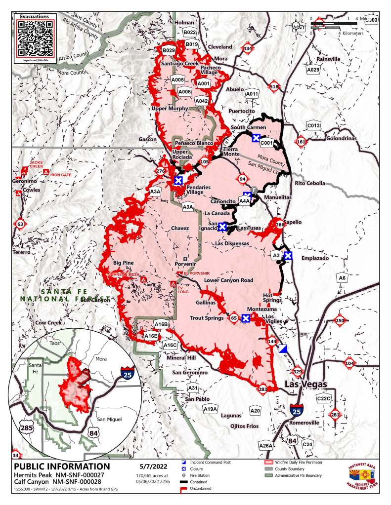 | Acres: 170,665 acres – Containment: 21% – Total personnel: 1,422 Start Date: Hermits Peak: April 6, 2022; Calf Canyon: April 19, 2022 Cause: Hermits Peak: spot fires from prescribed burn; Calf Canyon: under investigation Location: Located near Gallinas Canyon – Fuels: Heavy mixed conifer, ponderosa pine, brush, and grass |
