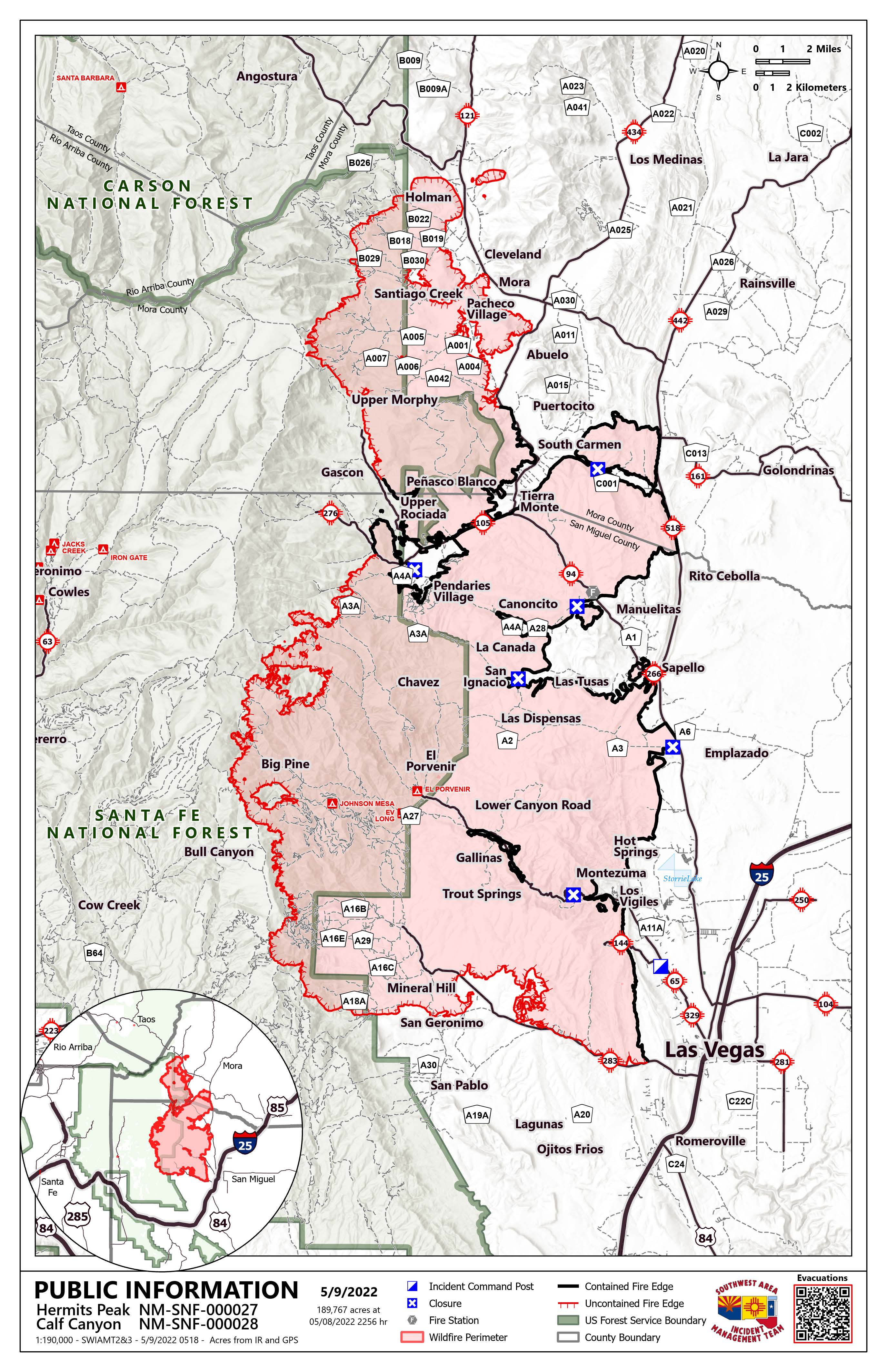 Operaciones: En el lado norte, ayer, los incendios puntuales se han desarrollado al norte de la carretera 518 de NM. Incendios puntuales se producen cuando el viento arrastra las brasas a través de la línea de fuego y enciende los combustibles en una nueva área. Hoy podría extenderse rápidamente hacia el noreste en dirección a El Turquillo, con manchas de largo alcance y un comportamiento extremo del fuego. Los bomberos permanecerán si es seguro. Se han establecido muchas líneas y se han tomado medidas de protección de estructuras. En el lado este, desde Ledoux hasta Las Vegas, la línea de fuego ha resistido los fuertes vientos, lo que ha permitido aumentar la contención. Los equipos de bomberos seguirán vigilando y patrullando esas zonas. En el sur, el fuego sigue siendo muy activo. Hoy se espera que se mueva hacia el Pico Barillas y San Gerónimo. Los grupos de estructura continúan trabajando en la zona y más al sur para minimizar los impactos en las viviendas e infraestructuras. Los bomberos están trabajando en la construcción y unión de dozer y handline con las carreteras y sistemas de senderos existentes para atraparlo. Las predicciones también muestran que el fuego en esta zona podría retroceder en sí mismo debido a la dirección del viento y el terreno. Cerca de Bull Creek y al oeste de Upper y Lower Colonias, los bomberos están trabajando para construir una línea de contingencia y unirla a las líneas existentes. Más arriba en el oeste, el fuego está retrocediendo hacia Lone Pine Mesa y Blue Bell Ridge en el Pecos Wilderness y las tripulaciones están monitoreando. Los bomberos siguen trabajando alrededor de Rosiada y las comunidades circundantes para proteger las estructuras y guiar el fuego alrededor de las casas. Al norte de Gascón, el fuego está empujando hacia el desierto cerca de Enchanted Lake.