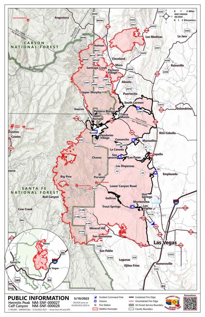 Future Fire Information: The Hermits Peak and Calf Canyon Fires Information office hours are 8:00 AM – 8:00 PM. The phone number for fire information is 505-356-2636. The email address is 2022.hermitspeak@firenet.gov. Fire information is posted on Inciweb, the SFNF Facebook and Twitter, SFNF website, and New Mexico Fire Information website.