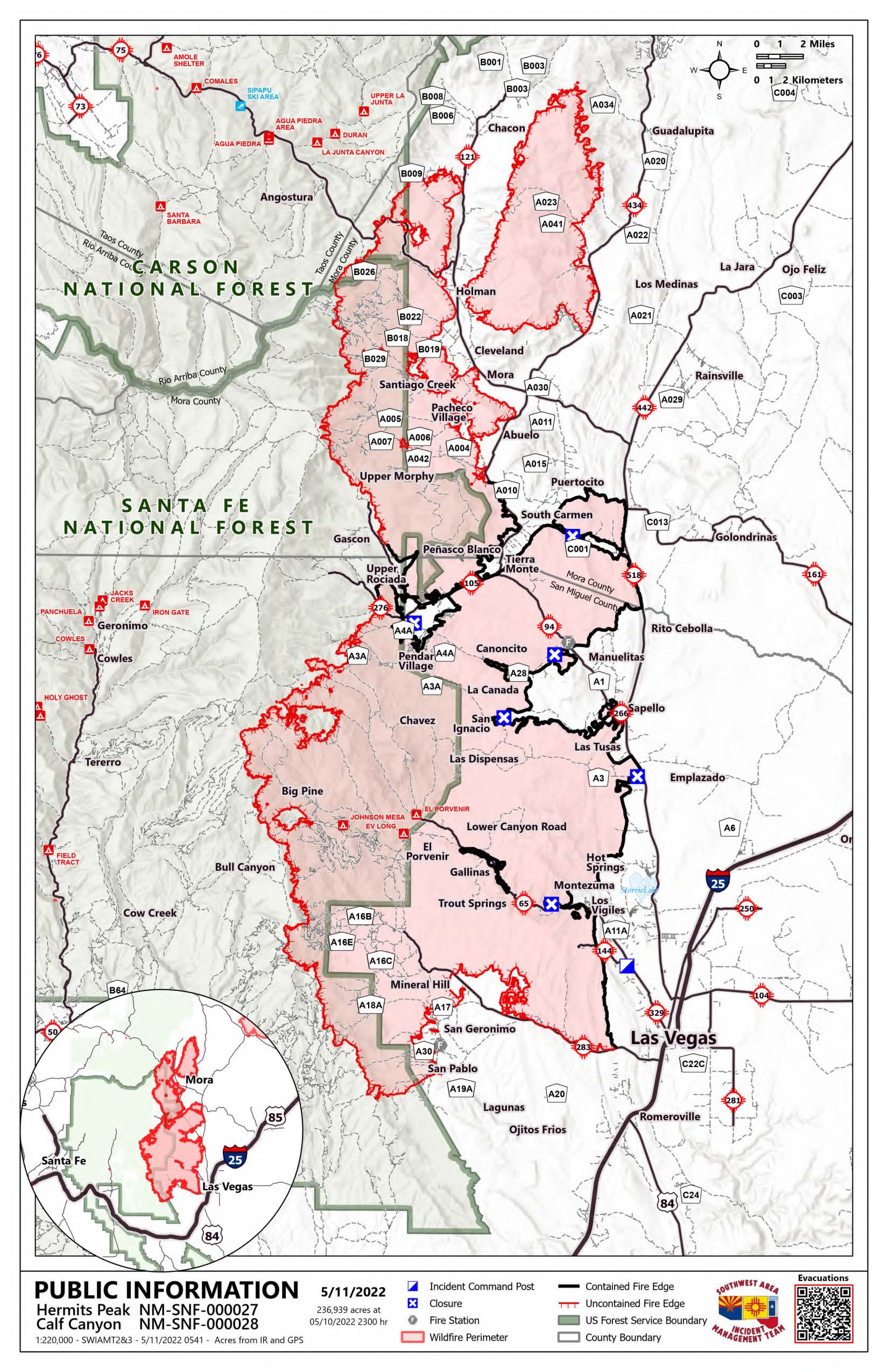 Evacuaciones: Escanee el código QR o haga clic en este enlace (https://tinyurl.com/HermitsPeak) para acceder a un sitio web con el evacuation map, más reciente, el perímetro del incendio, el mapa de progresión diario y los cierres. Por favor, siga San Miguel County and Mora County Sheriff’s Facebook para las últimas actualizaciones en https://www.facebook.com/smcso.nm y https://www.facebook.com/moracountysheriffoffice y Taos County https://www.facebook.com/profile.php?id=100064642843163 Sheriff’s Facebook pages for the latest evacuation updates.