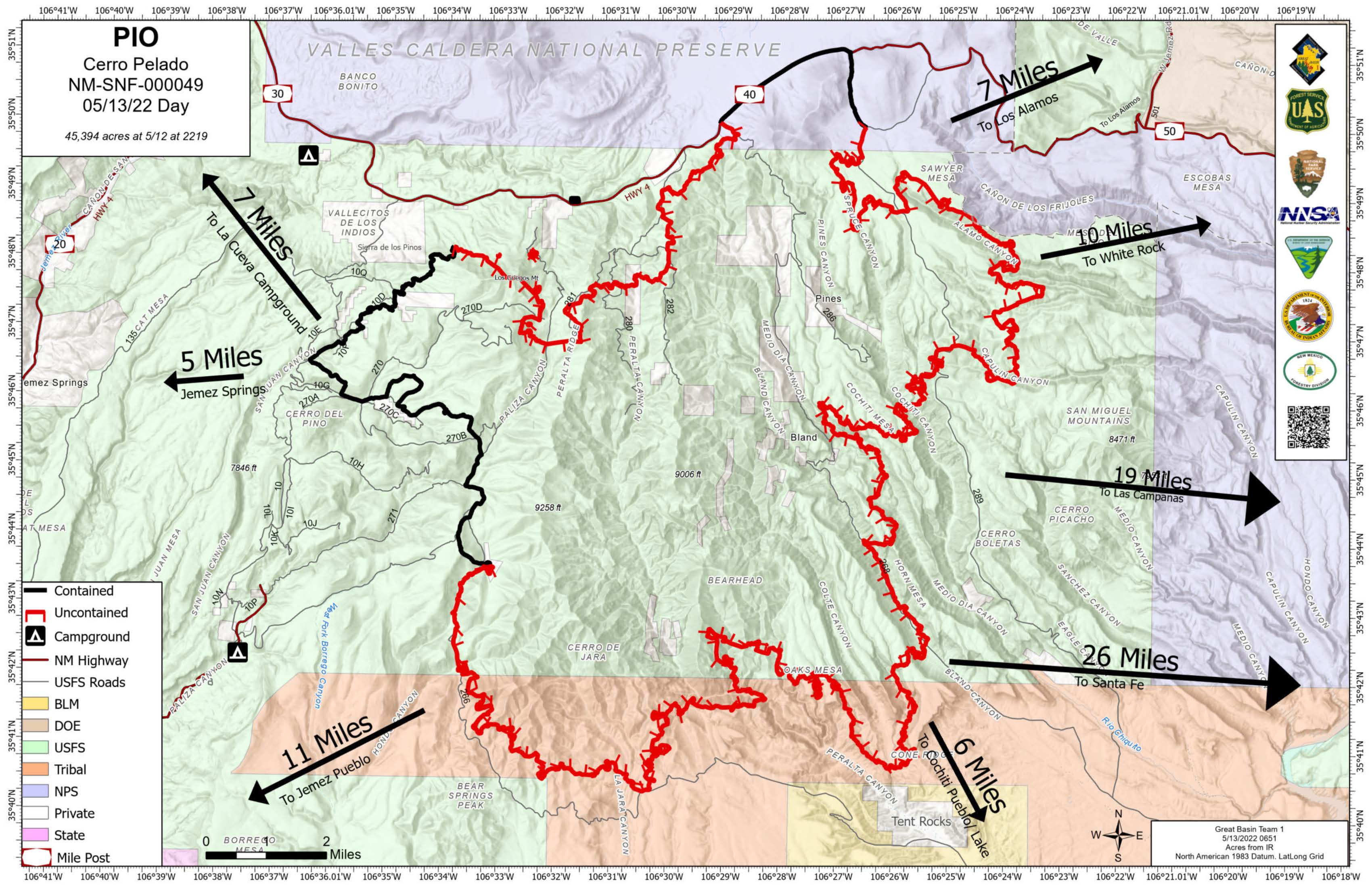 Evacuation status: Los Alamos County remains in “Set” evacuation level. The communities of Cochiti Mesa and the Peralta Canyon area, including Cox Ranch, remain under “Go” evacuation status. Evacuations for Sierra de Los Pinos and Valles Caldera National Preserve remain in “Set” mode, meaning residents should be ready to leave at a moment’s notice. Jemez Springs, La Cueva and Cochiti Lake area remain in “Ready” status. Counties will provide updated information on evacuations as needed.