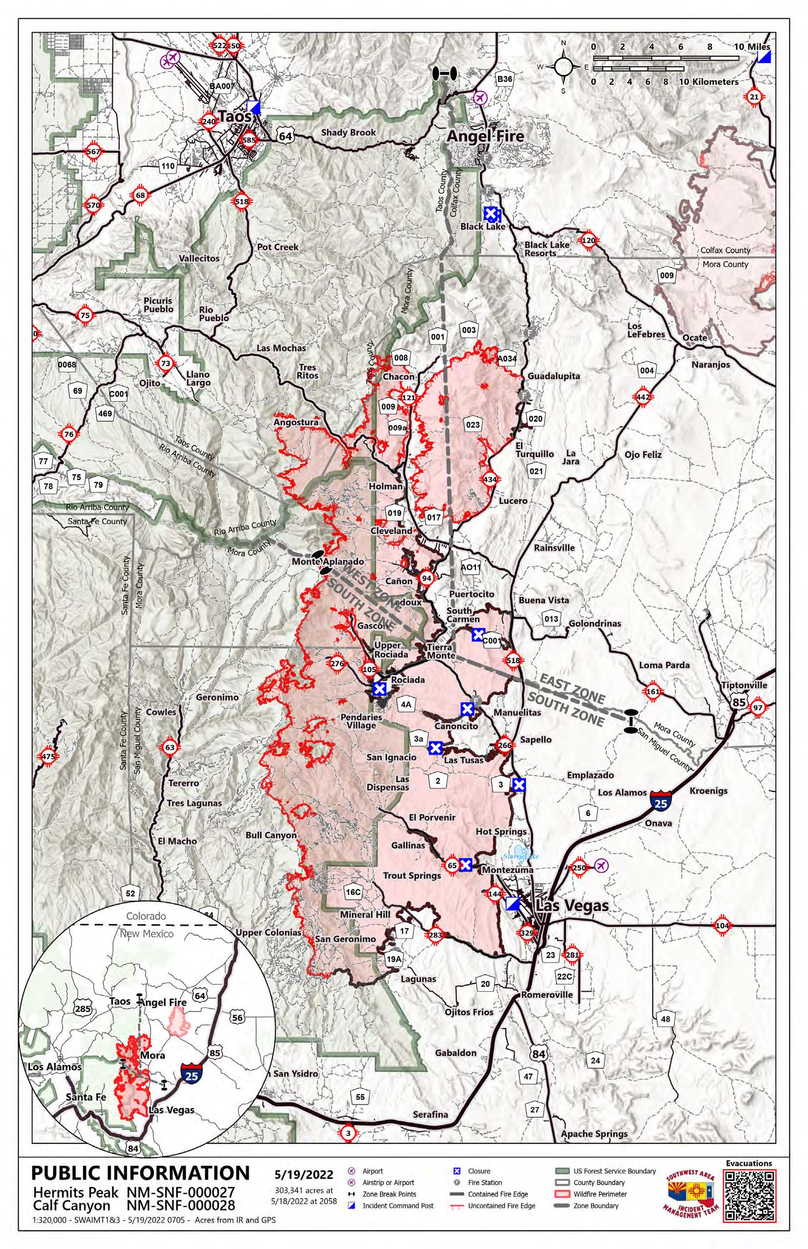 Lo más destacado: Hoy hay un aviso de bandera roja en vigor para la zona del incendio. Los incendios de Hermits Peak y Calf Canyon se han dividido en tres zonas: Zona Este, Zona Oeste y Zona Sur. La Zona Oeste, que incluye el condado de Taos, y el condado de Mora al oeste del corredor de la carretera NM 434 hasta la línea del condado de San Miguel, está bajo el mando del Equipo de Gestión de Incidentes del Área Suroeste 1 (SWAIMT1). El Equipo de Gestión de Incidentes Interinstitucional de California 2 (CAIIMT2) ha tomado el mando de la zona este del incendio, que incluye el área del condado de Colfax y el condado de Mora al este del corredor 434, al sur de la línea del condado de San Miguel. El Equipo de Gestión de Incidentes del Área Suroeste 3 (SWAIMT3) está al mando de la Zona Sur, que consiste en el área del incendio dentro del Condado de San Miguel. Los residentes de los condados de San Miguel, Mora, Taos y Colfax deben permanecer en alerta máxima para los cambios en los estados de evacuación y los cierres de carreteras. La etapa 3 de cierres en todo el bosque para el Bosque Nacional de Santa Fe y Carson entra en vigor a las 8 a.m. de hoy.