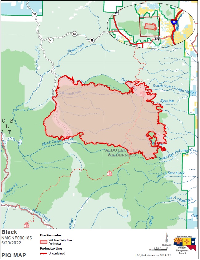 | Acres: 104,969 acres Location: 31 miles NW of Truth or Consequences Containment: 0% Personnel: 475 | Start Date: Friday, May 13, 2022 Cause: Human caused, under investigation Fuels: Timber and tall grass |