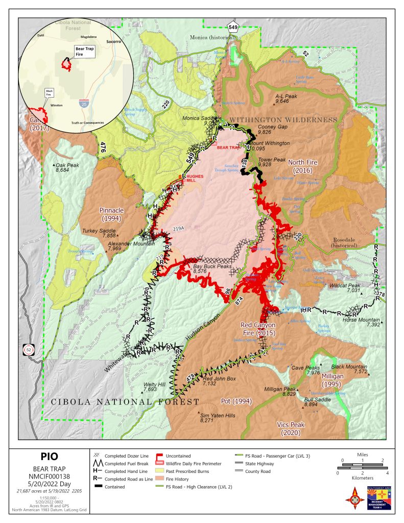Smoke: Smoke from the Bear Trap Fire and other nearby fires may be visible in the areas of Alamo, Datil, Magdalena, Socorro, Winston, and San Antonio, NM. Smoke-sensitive individuals and people with respiratory problems or heart disease are encouraged to take precautionary measures. Information on air quality and protecting your health can be found at the New Mexico Department of Health Environmental Public Health Tracking website: nmtracking.org. An interactive smoke map at https://fire.airnow.gov/ allows you to zoom into your area to see the latest smoke conditions.