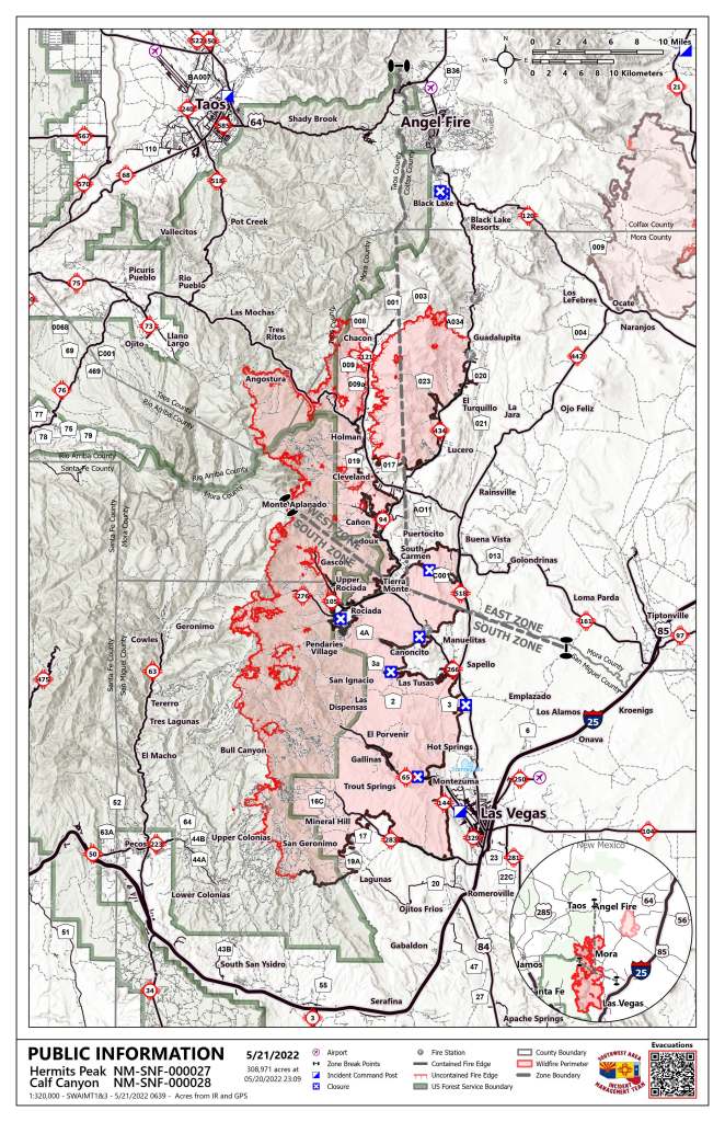 Humo: Un mapa de humo interactivo en fire.airnow.gov/ te permite hacer zoom a tu zona para ver las condiciones presentes de humo.Información acerca de los Incendios: Horario de la Oficina de Información acerca de los Incendios: 8:00 AM – 8:00 PM | Teléfono: 505-356-2636 | Correo Electrónico: 2022.hermitspeak@firenet.gov | En línea: inciweb.nwcg.gov/incident/8069/| facebook.com/CalfCanyonHermitsPeak | nmfireinfo.com |tinyurl.com/HermitsYouTube| Santa Fe NF Website|