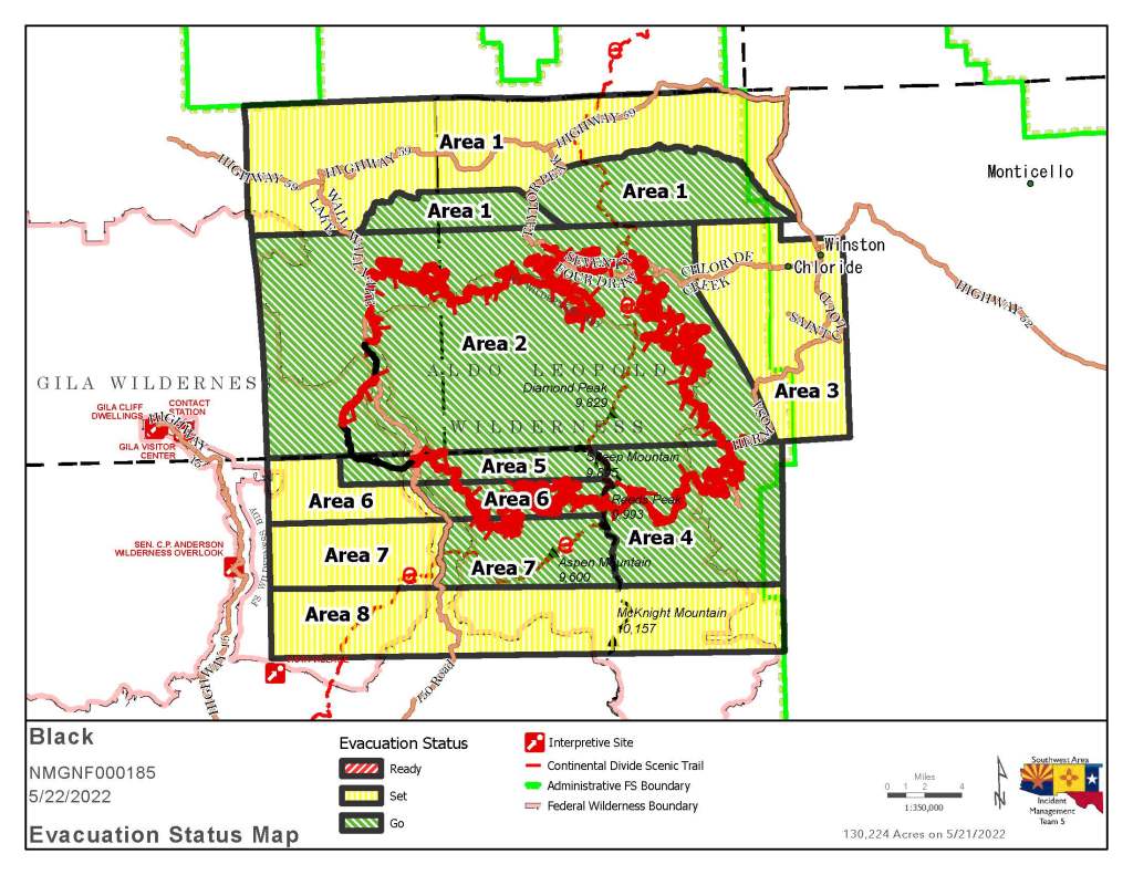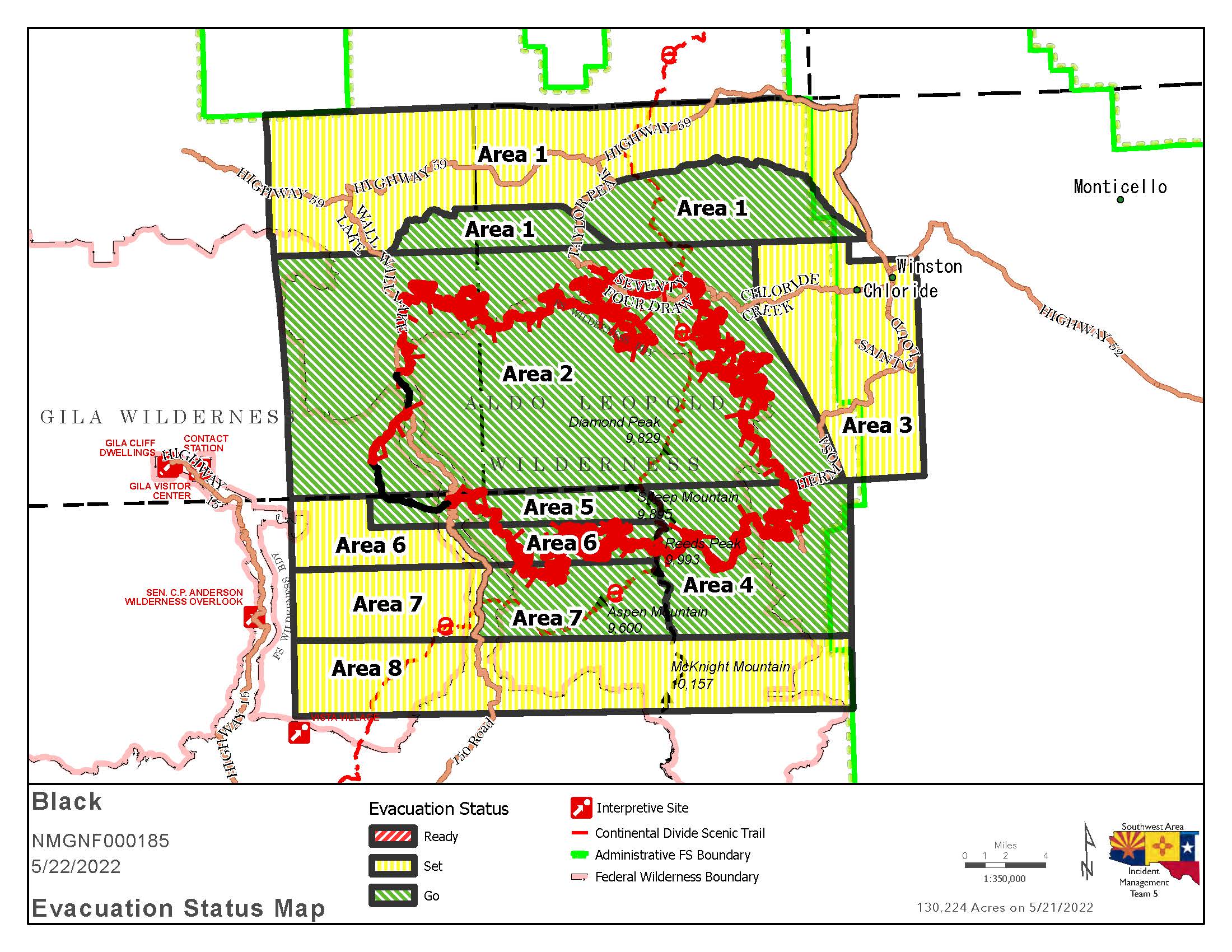 Evacuations: In coordination with Catron, and Sierra counties, the evacuation status for the following areas have changed: An additional portion of Area 1 has been moved to GO. Starting from Taylor Peak northeast to Kline Mountain, then east to Turkey Creek, following the Bear Creek Road southeast tying back into the north end of Area 3. Area 7 west of Forest Road 150 has been moved to SET; Area 7 east of Forest Road 150 has been moved to GO. Area 8 has been moved to Set.