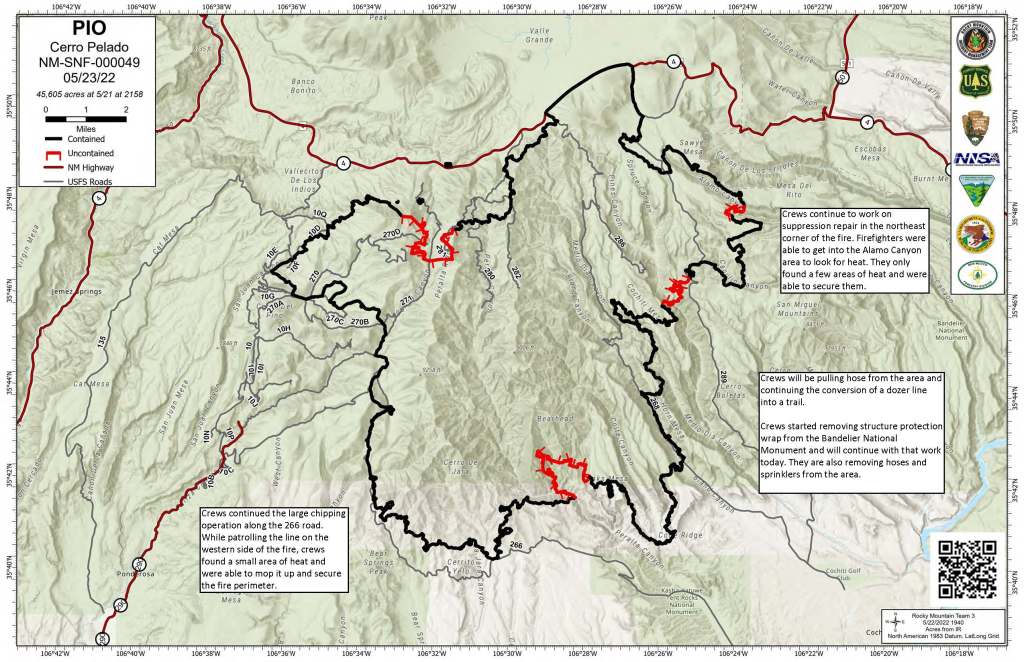 FIRE OPERATIONS: Crews were able to complete mop up of the fire line near Peralta Canyon road and remove unnecessary equipment. Suppression work in the area was also completed. Crews continue to work on suppression repair in the northeast corner of the fire. Firefighters were able to get into the Alamo Canyon area to look for heat. They only found a few areas of heat and were able to secure them. Crews will be pulling hose from the area and continuing the conversion of a dozer line into a trail. The large chipping operation along the 266 road will continue today. While patrolling the line on the western side of the fire, crews found a small area of heat and were able to mop it up and secure the fire perimeter. Crews started removing structure protection wrap from the Bandelier National Monument and will continue with that work today. They are also removing hoses and sprinklers from the area. Night division will be out again tonight to patrol the line and ensure no perimeter growth.