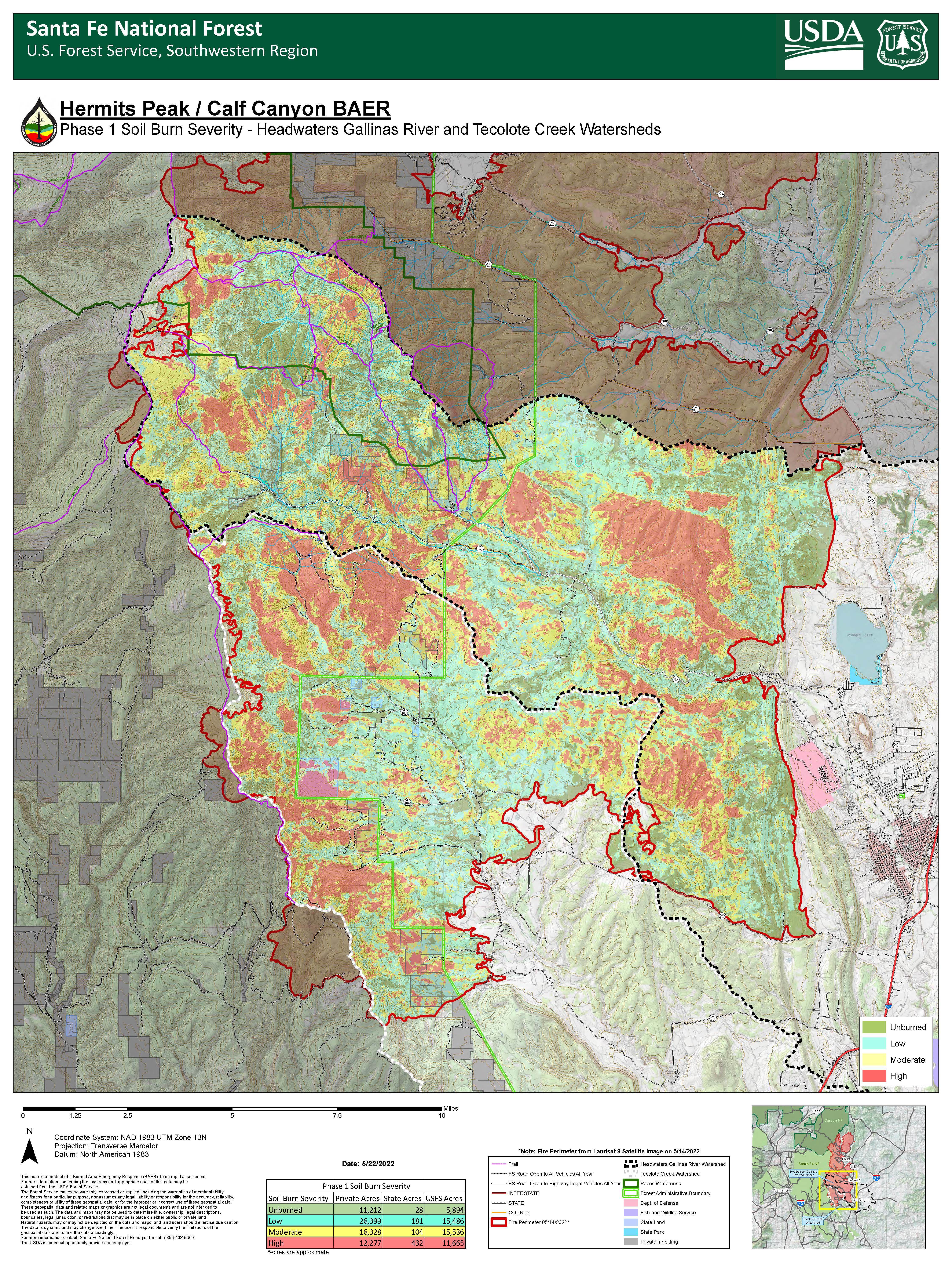 On May 22, 2022, BAER team specialists completed data gathering and analysis for Phase 1 of the Hermits Peak – Calf Canyon burned area. The soil burn severity (SBS) map analyzes 115,542 acres for the Headwaters Gallinas River and Tecolote Creek watersheds. The map and the data display soil burn severity (SBS) categories of unburned/very low, low, moderate, and high. Approximately 51% of the Phase 1 acres are either unburned/very low or low SBS, while 28% sustained a moderate SBS and 21% identified as high SBS. Areas within the watersheds that were assessed continue to burn and the potential for reburn exists where unburned, very low and low SBS is present.