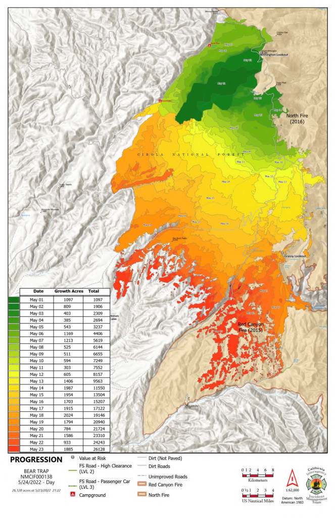 Highlights: The California Interagency Incident Management Team 10 assumed command of the fire this morning with Incident Commander Eric Petterson. The Southwest Area Incident Management 4 will be leaving today after transferring command. A daily operational briefing video explaining details of the Bear Trap Fire operations will continue on the Cibola National Forest Facebook page. A Red Flag Warning is in effect this afternoon and early evening.