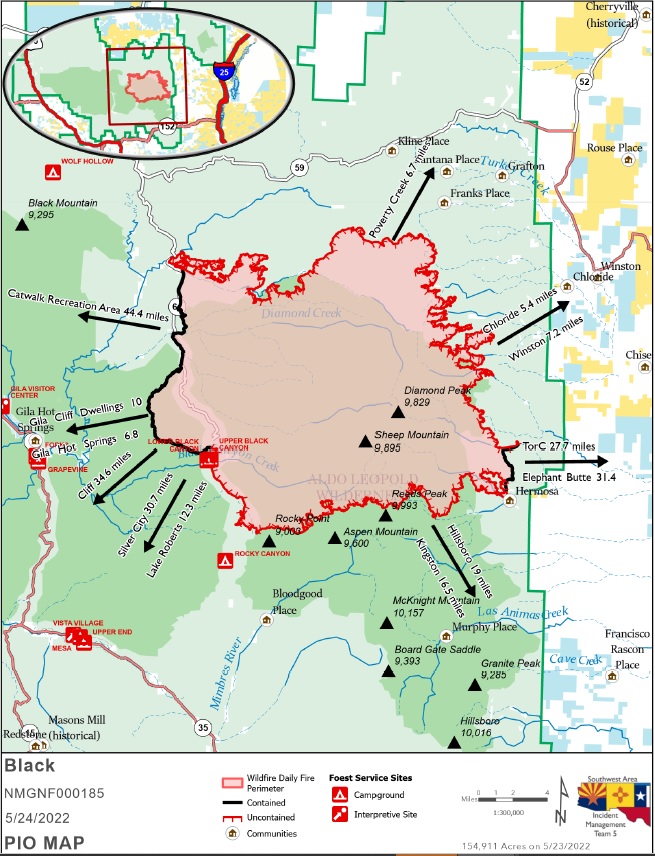 | Acres: 154,911 acres Location: 31 miles NW of Truth or Consequences Containment: 11% Personnel: 646 | Start Date: Friday, May 13, 2022 Cause: Human caused, under investigation Fuels: Timber and tall grass Structures Lost: 2 |