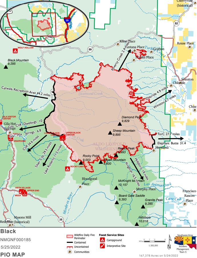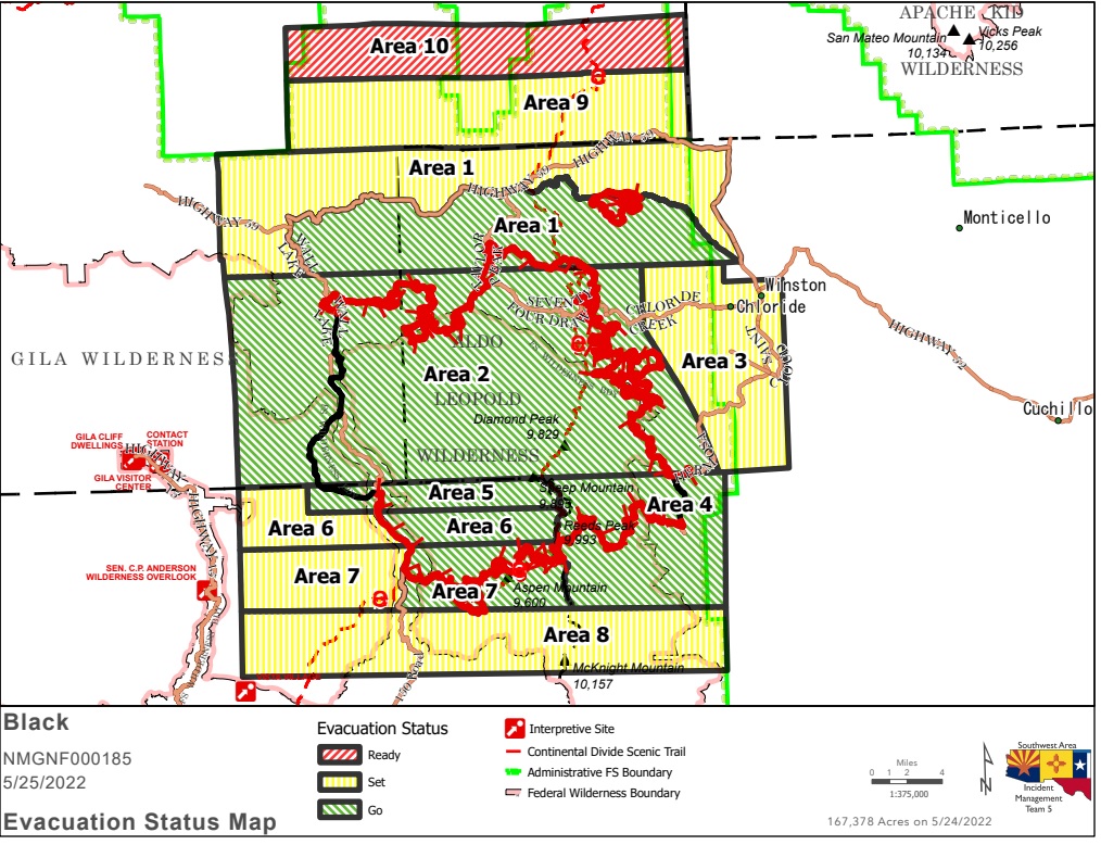 Evacuation Update: Effective at 10 pm, Tuesday, May 24, 2022, additional evacuations have been implemented because of fire activity on the Black Fire. In coordination with Grant, Catron, and Sierra counties, the following areas are under a level of evacuation status: