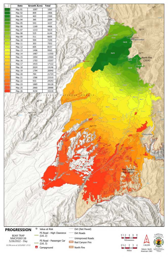 Highlights: Continued windy conditions Wednesday allowed for a good test of the fire perimeter. All containment lines held, including the area that was reestablished Tuesday evening after fire crossed containment lines. Where safe, crews were able to strategically reinforce hand and dozer lines using proactive, low-intensity firing and air operations. Aerial and ground patrols continued. Most resources were focused on the southwest and south areas where fire is actively burning in the interior. A daily operational briefing video explaining details of the Bear Trap Fire operations can be viewed on the Cibola National Forest Facebook page.