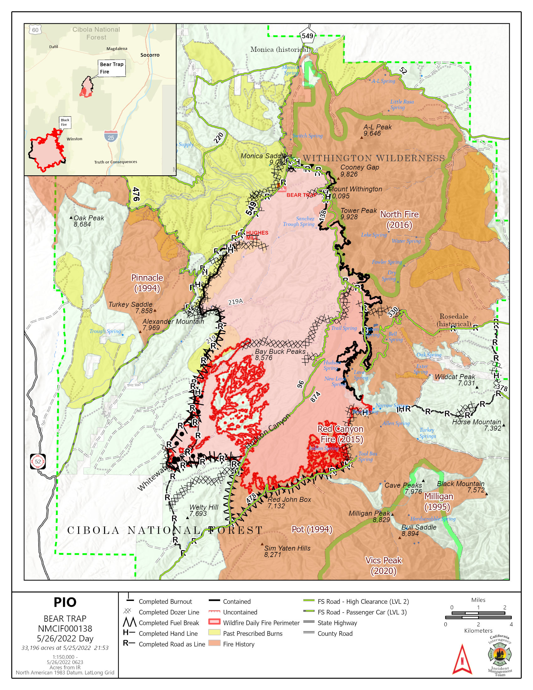 Highlights: Continued windy conditions Wednesday allowed for a good test of the fire perimeter. All containment lines held, including the area that was reestablished Tuesday evening after fire crossed containment lines. Where safe, crews were able to strategically reinforce hand and dozer lines using proactive, low-intensity firing and air operations. Aerial and ground patrols continued. Most resources were focused on the southwest and south areas where fire is actively burning in the interior. A daily operational briefing video explaining details of the Bear Trap Fire operations can be viewed on the Cibola National Forest Facebook page.