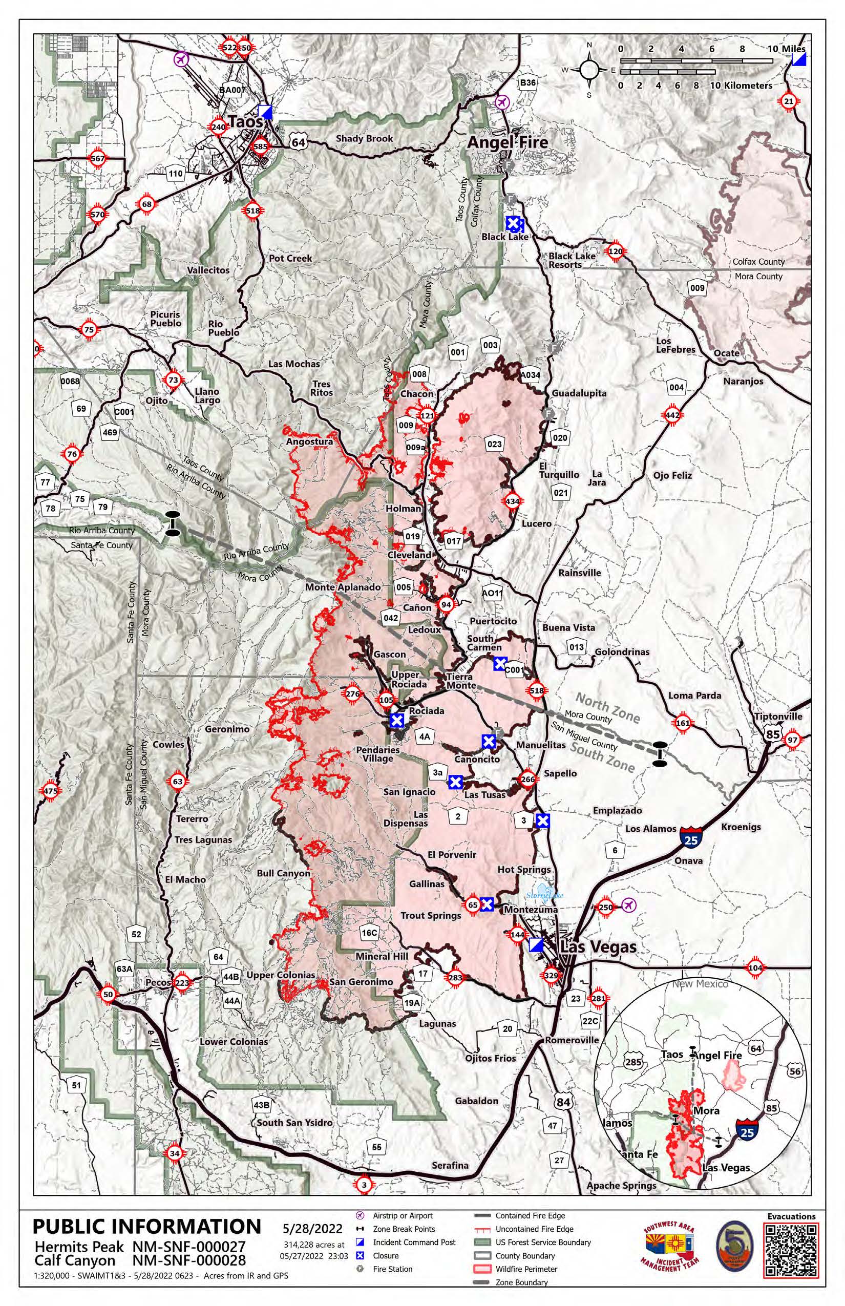 Highlights: A Red Flag Warning in effect today may contribute to an increase in fire behavior and visible smoke from fire burning within the perimeter. Firefighters are holding and patrolling lines across the fire to prevent escape and defend structures in areas with active heat. Please use caution when traveling through the fire area this weekend as there will be heavy fire traffic in addition to visitors for the holiday. Residents of San Miguel, Mora, Taos, Colfax and Santa Fe Counties should remain on high alert for changes to evacuation statuses and road closures.