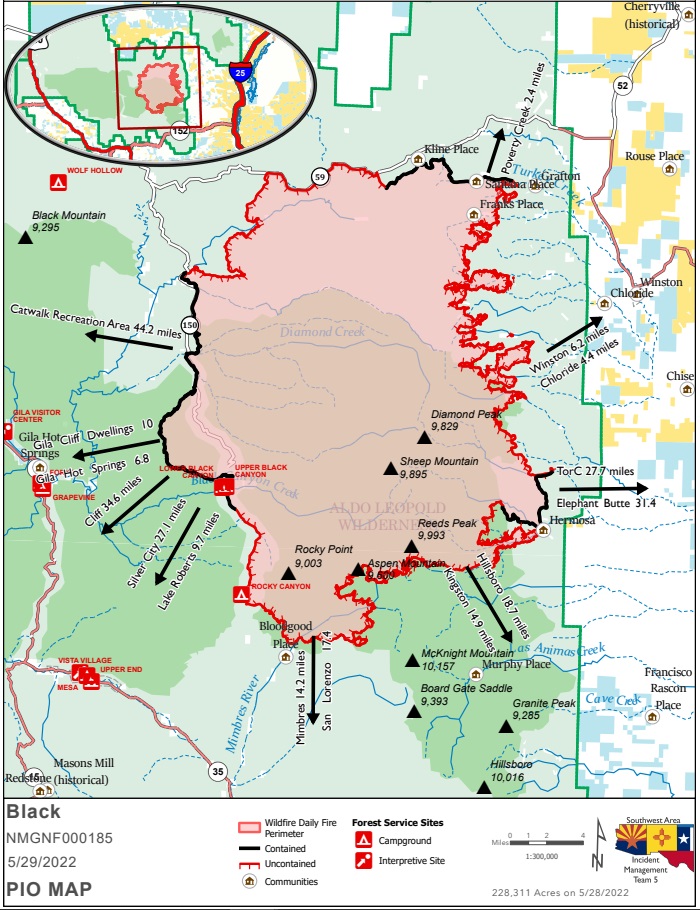 Closures: Highway 59 is closed from Mud Hole west to the 59/150 intersection Poverty Creek residents may access their property. Forest Road 150 is also closed at the North Star Helispot due to fire activity. I-25 and other state highways remain open. As a result of continued fire growth, an area closure has been implemented for public and firefighter safety. Visit: https://www.fs.usda.gov/alerts/gila/alerts-notices/?aid=73018 for additional information.