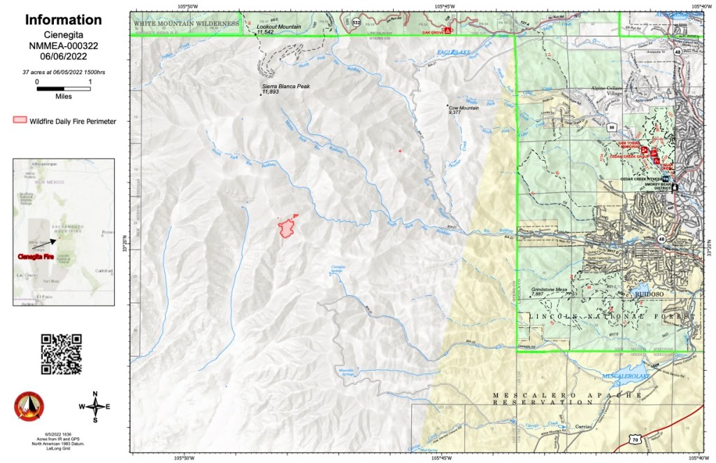 Ruidoso, NM – The Cienegita Fire was ignited by lightning on June 3 after multiple lightning strikes hit the area. The fire is located approximately four miles northwest of the Village of Ruidoso, New Mexico, on the Mescalero Apache Indian Reservation and is 37 acres with 25% contained. Hand crews and aircraft have stopped forward progress of the fire; resources are constructing handlines to enforce this containment. There are no mandatory evacuation notices in effect; however, Upper Canyon, Park Canyon and Brady Canyon, within the Village of Ruidoso, is in a state of readiness to evacuate, if necessary. Upper Canyon, Cedar Creek and Alpine Village, within Lincoln County, are also in a state of readiness. The fire is burning ponderosa pine, mixed conifer and timber litter in an area that is difficult and hazardous to access. This presents significant safety concerns for firefighters working to contain the fire. Hand crews and aircraft are working to stop the fire’s growth. Evacuation Notices in “Ready”: If conditions allow, all notices will be lifted the evening of June 5.