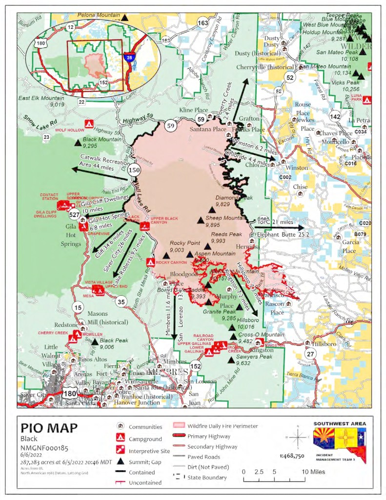 Closures: Highway 59 is closed from Mud Hole to the 59/150 intersection. Forest Road 150 is also closed at the North Star Helispot. I-25 and other state highways remain open. A portion of the Gila National Forest affected by the fire has been closed.