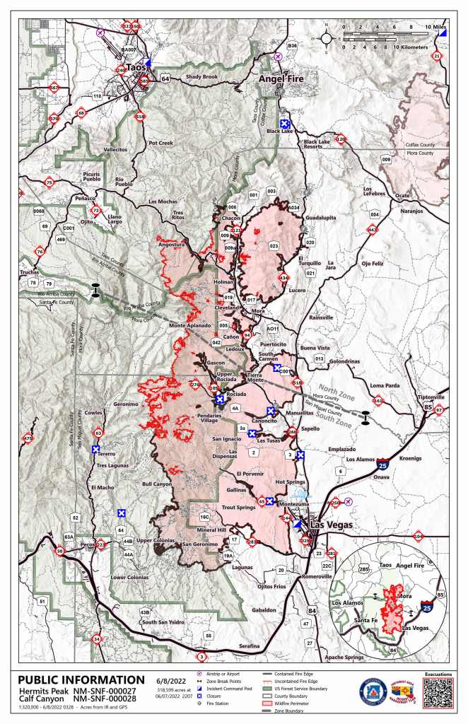Acres: 318,599 | Contención: 65% | Personal total: 2,773 |Fecha de inicio: Hermits Peak: 6 de abril de 2022; Calf Canyon: 19 de abril de 2022 | Causa: Hermits Peak: Fuegos salpicados por quemaduras prescritas; Calf Canyon: Restos de un incendio prescrito | Ubicación: Cerca de Gallinas Canyon Combustibles: Mezcla densa de coníferas, pino ponderosa, arbustos y hierba