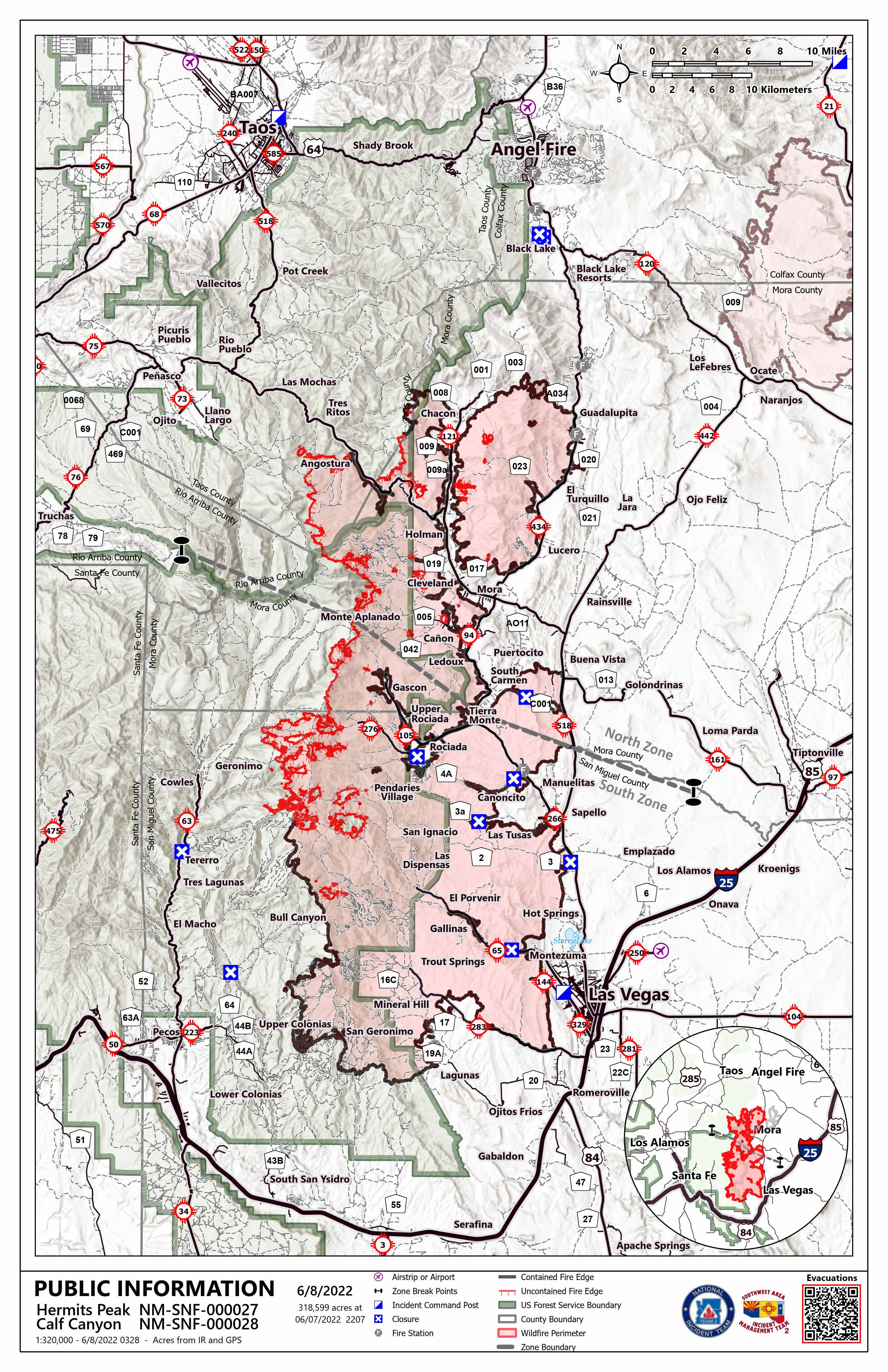 Acres: 318,599 | Contención: 65% | Personal total: 2,773 |Fecha de inicio: Hermits Peak: 6 de abril de 2022; Calf Canyon: 19 de abril de 2022 | Causa: Hermits Peak: Fuegos salpicados por quemaduras prescritas; Calf Canyon: Restos de un incendio prescrito | Ubicación: Cerca de Gallinas Canyon Combustibles: Mezcla densa de coníferas, pino ponderosa, arbustos y hierba