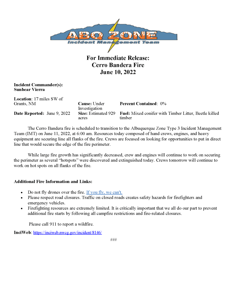Cerro Bandera Fire – Cibola County – June 10, 2022
