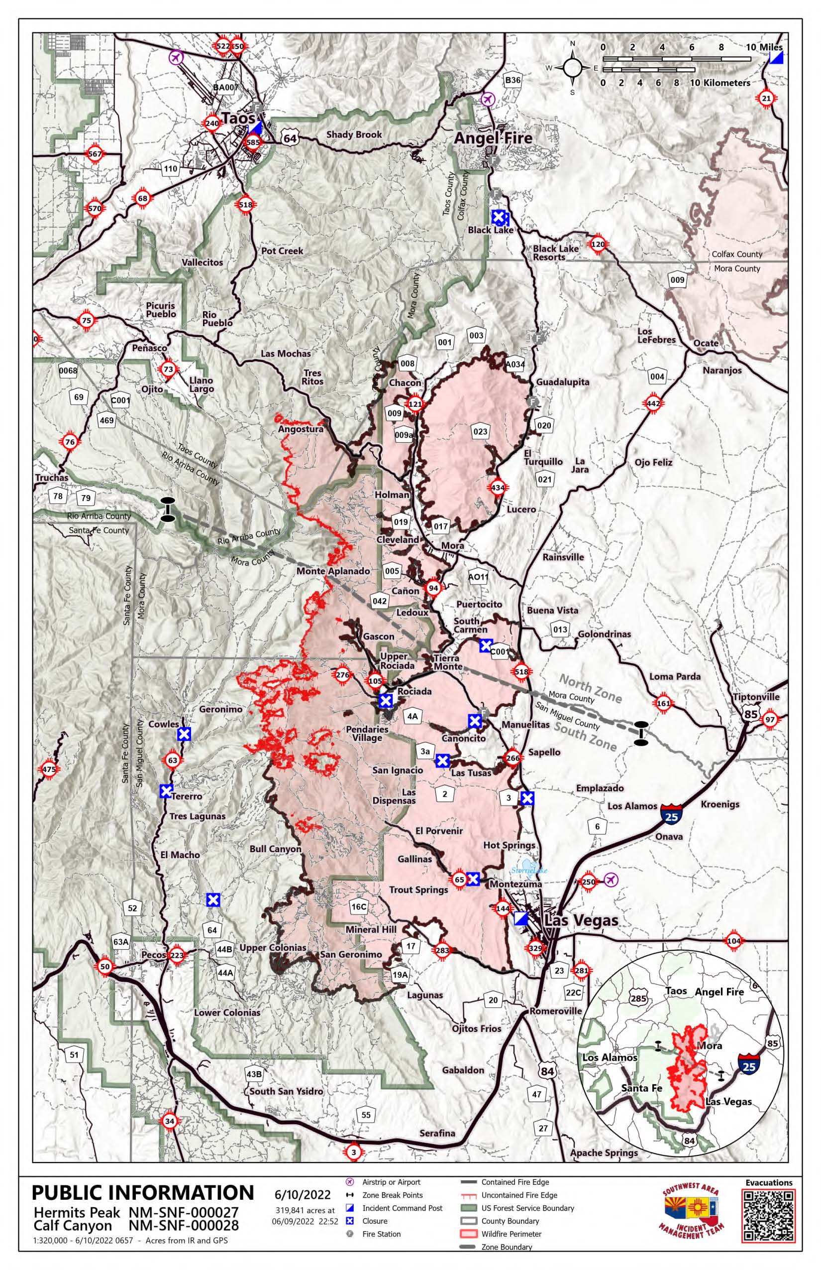 Acres: 318,599 | Contención: 65% | Personal total: 2,672 | Fecha de inicio: Hermits Peak: 6 de abril de 2022; Calf Canyon: 19 de abril de 2022 | Causa: Hermits Peak: Fuegos salpicados por quemaduras prescritas; Calf Canyon: Restos de un incendio prescrito | Ubicación: Cerca de Gallinas Canyon | Combustibles: Mezcla densa de coníferas, pino ponderosa, arbustos y hierba