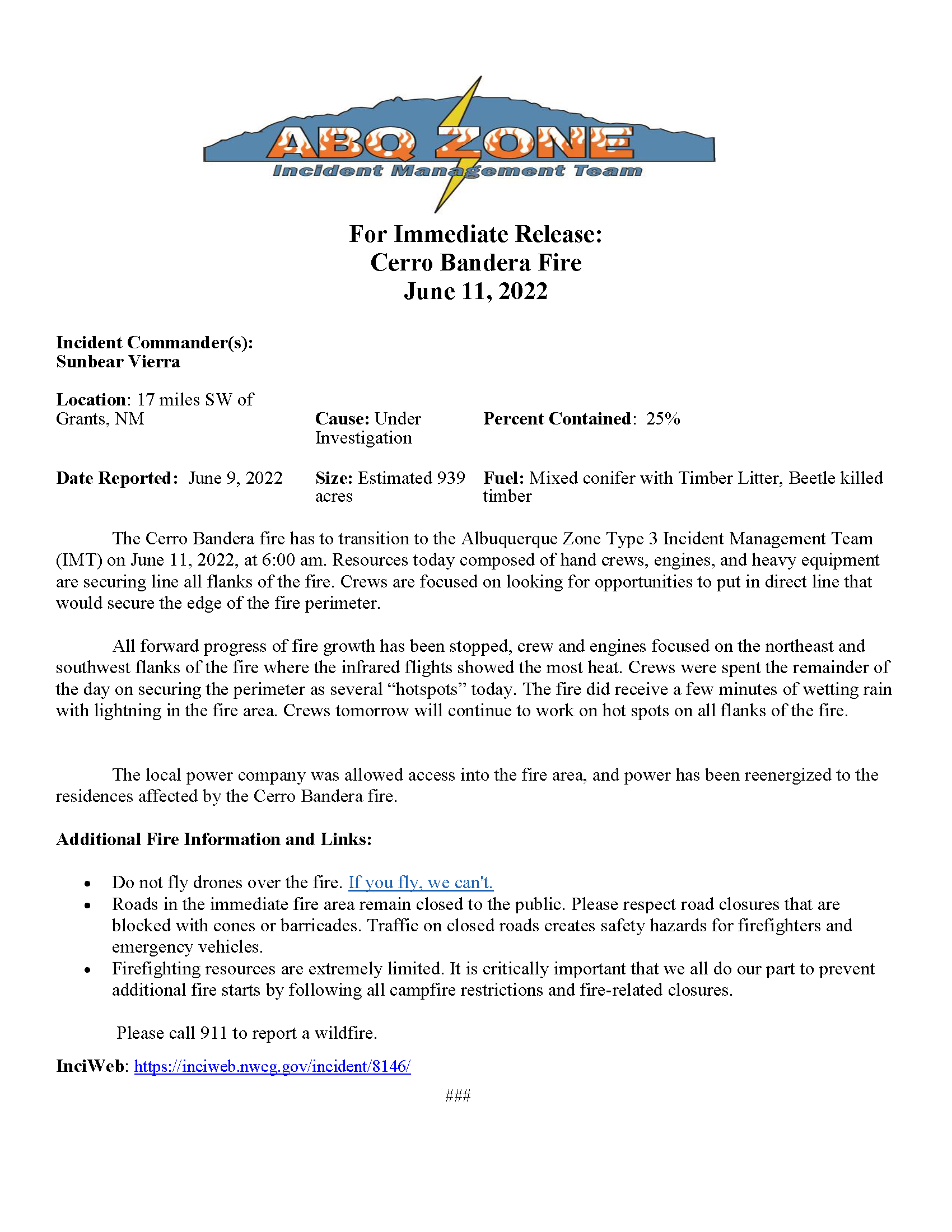 Cerro Bandera Fire – Cibola County – June 11, 2022